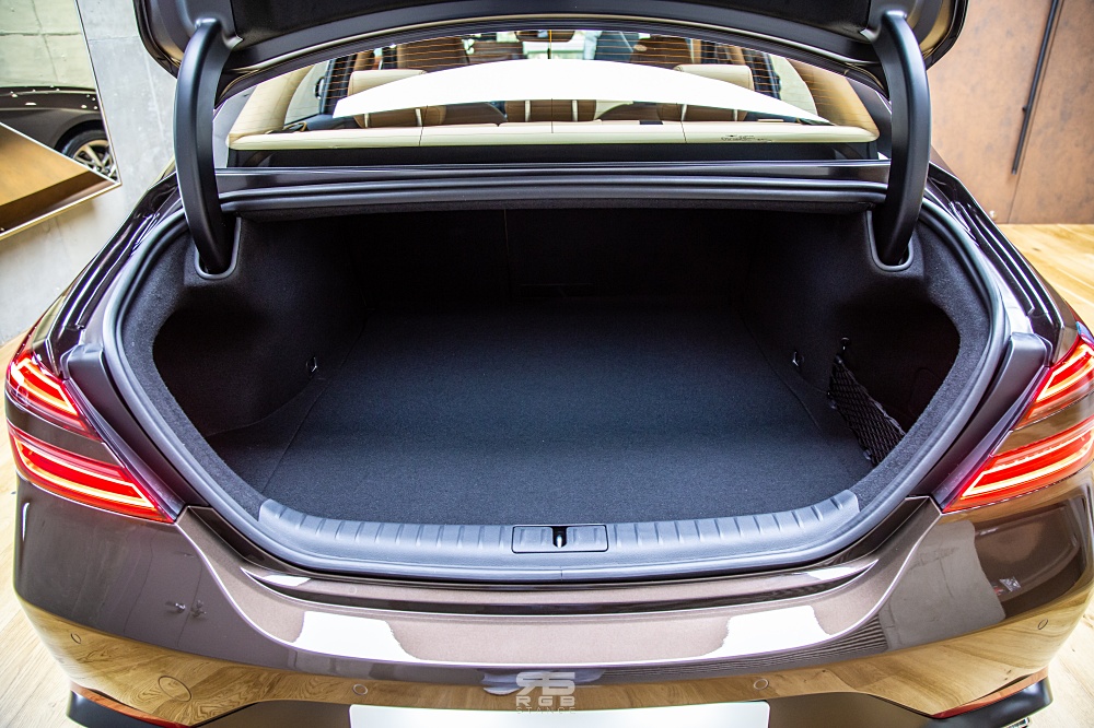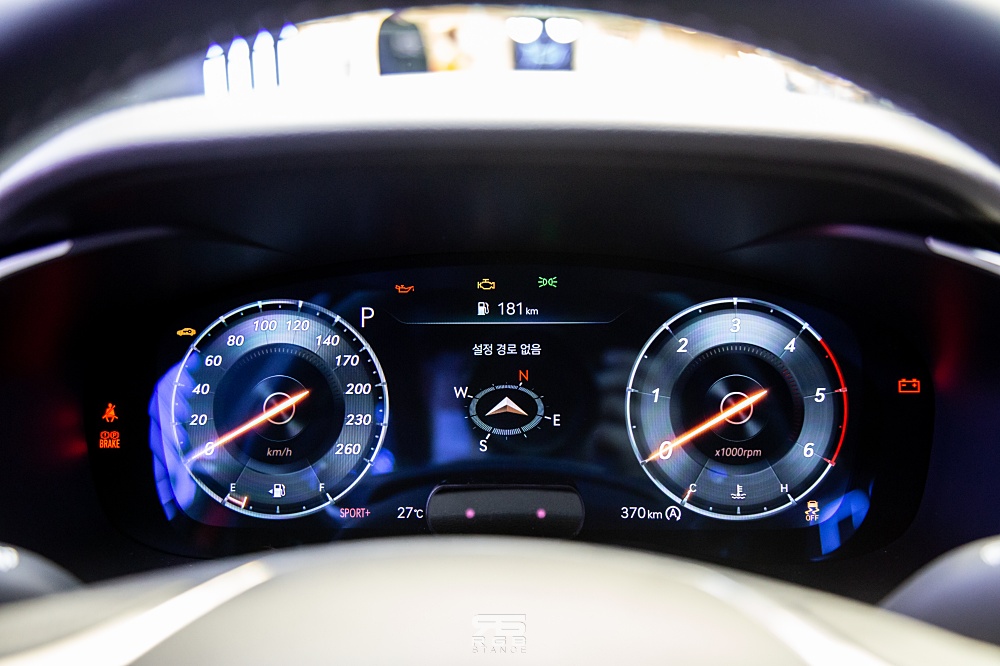 또한, 전면부의 크레스트 그릴과 두 줄의 쿼드램프가 제네시스 엠블럼의 형상화하고 있으며, 오버행이 짧아 역동적인 비율이 매력적이다.