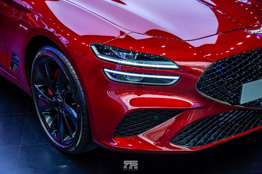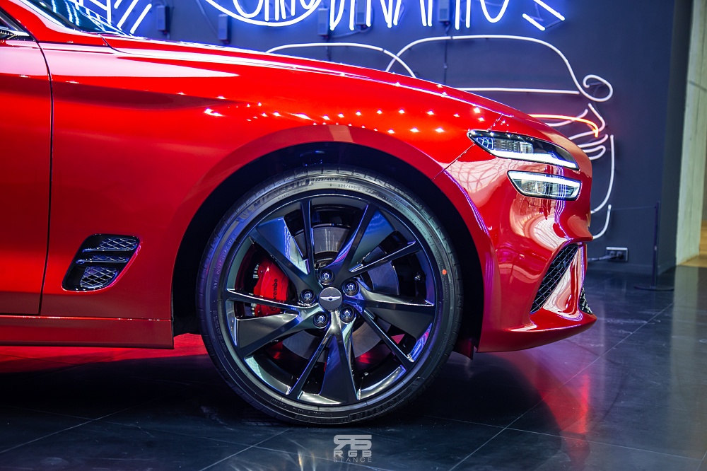 전시되어 있는 블레이징 레드 컬러의 '더 뉴 G70' 은 스포츠 패키지가 적용되어 있어서 프론트와 리어에 브렘보 브레이크가 적용되어 있고, 전용 휠도 함께 적용되어 있어 역동성을 보여주고 있다.