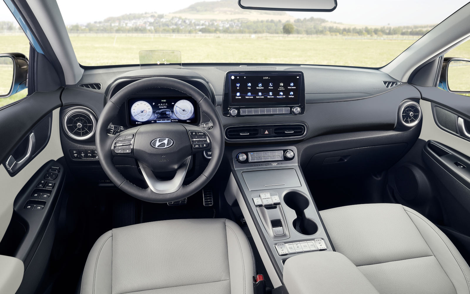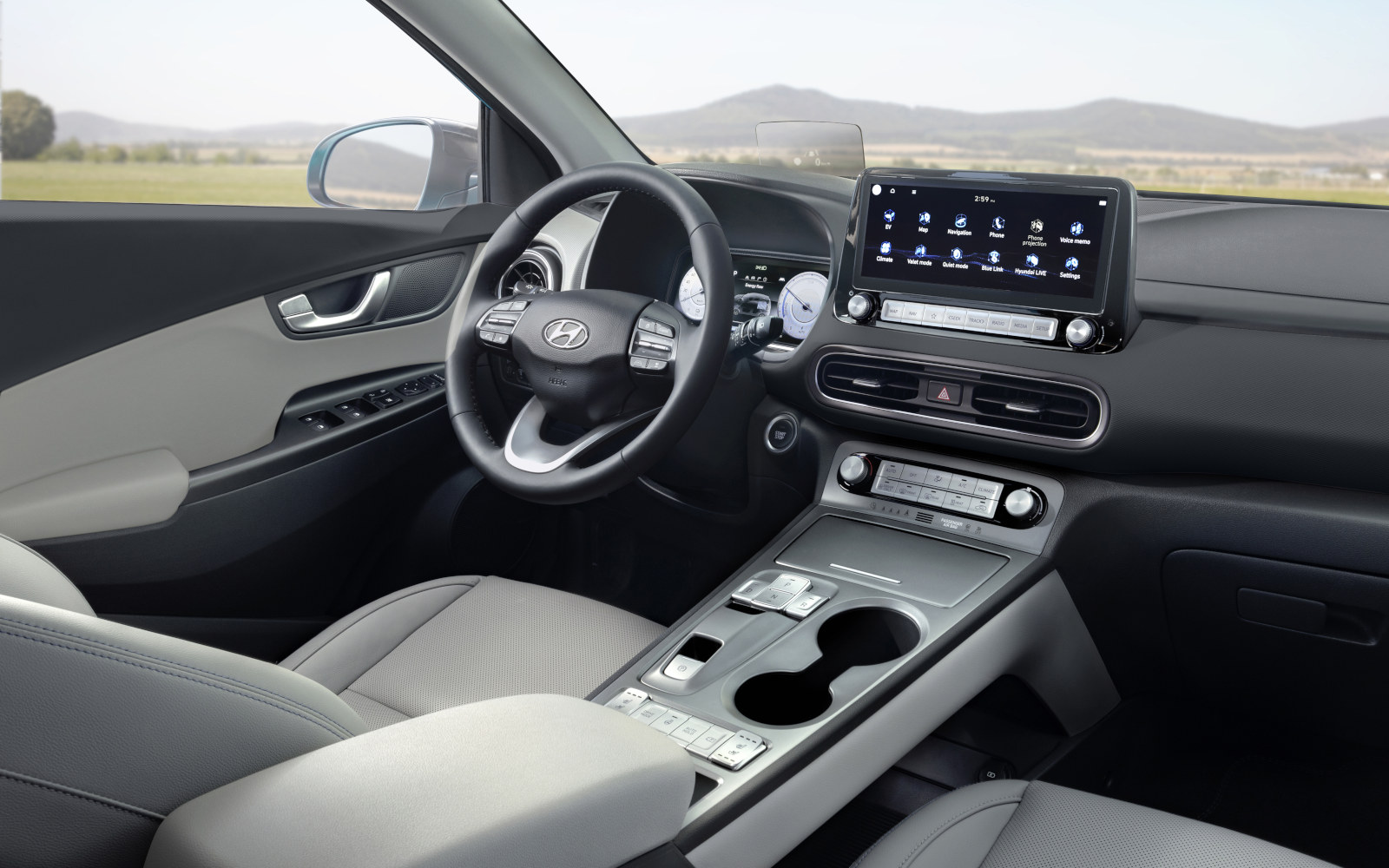 더 뉴 코나 일렉트릭의 실내 역시 페이스리프트 된 차량등과 크게 다르지 않으며, 10.25인치의 모니터와 함께, 계기판 역시 10.25인치 풀 디지털 클러스터로 업그레이드 되었으며, 애플 카플레이 및 안드로이드 오토 등 인포테인먼트 기능 등의 편의사양들이 추가되었다.