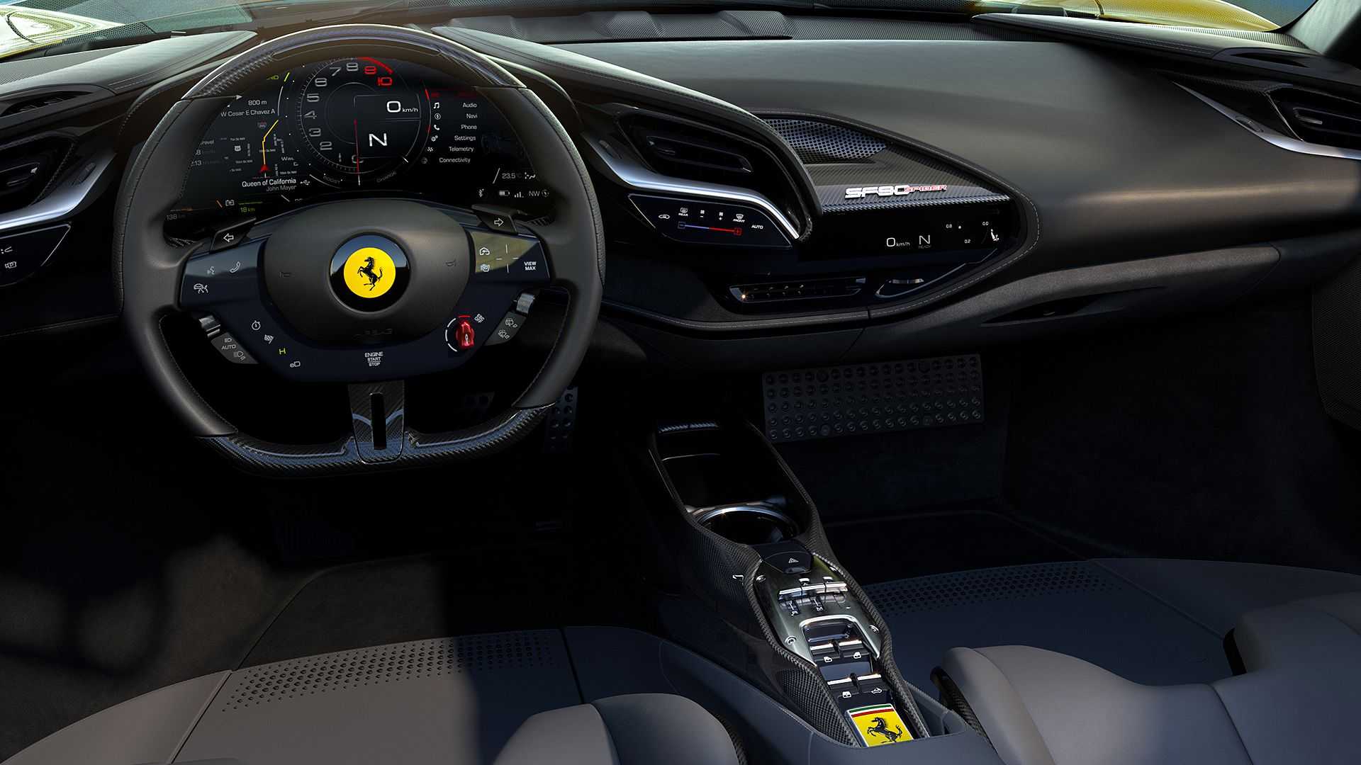 페라리 SF90 의 실내는 16인치 커브드 디스플레이가 적용되었으며, 스티어링휠에는 터치패드가 적용되어 편의성과 현대적인 감성을 녹였고, 센터터널에서는 페라리의 수동변속기를 현대적으로 재해석한 게이트식 기어가 적용되어 있다. 대시보드에는 HUD 가 적용되어 있으며, A 필러를 더 얇게 만든 동시에 스트라달레 모델보다 지붕을 20mm 낮추었다고 한다.