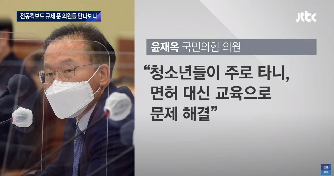 전동킥보드를 면허없이 탈 수 있도록 하자고 한 윤재옥 국민의힘 의원은 도로라는 곳에 대한 개념이 부족해 보인다. 도로는 자동차도 다니고, 사람도 통행을 하는 곳이다. 그런 도로를 면허 없이 다니게 한다는 것은 매우 무책임한 언행이라고 할 수 있다. 심지어 윤재옥 국민의힘 의원은 경기지방 경찰청장도 지냈던 사람인데, 전동킥보드가 어떤 문제들을 안고 있는지에 대해 전혀 모르면서도 법안개정을 했다는 점이 이해가 가질 않는다.