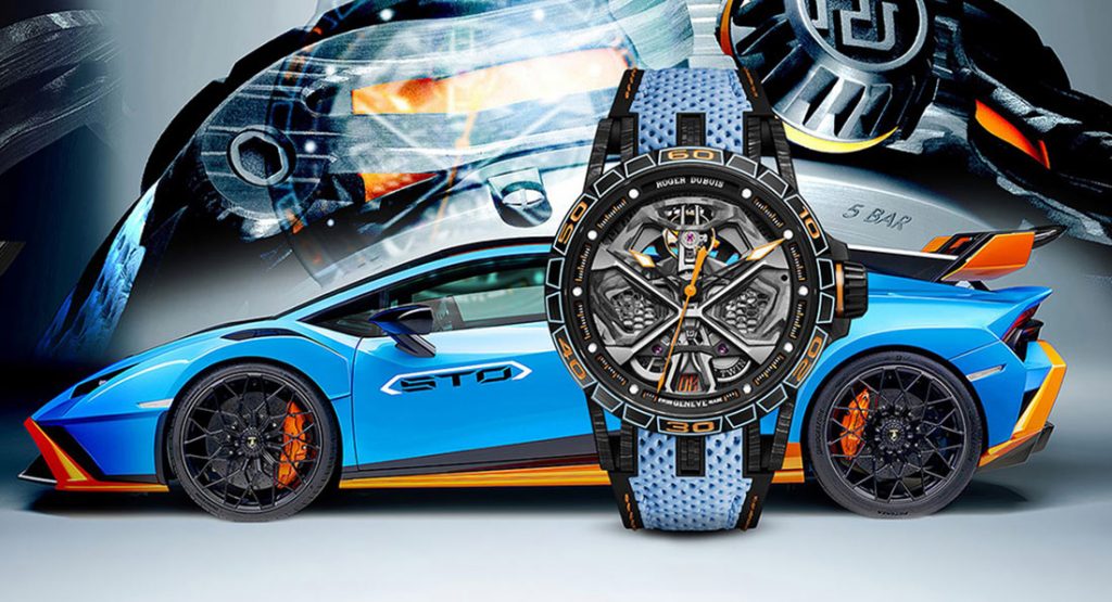 스위스의 시계 제조업체인 Roger Dubuis 에서 람보르기니 우라칸 STO 에서 영감을 받아 한정판 시계 '엑스칼리버'를 만들었다. 우라칸 STO 와 같은 캘리포니아 오렌지 및 블루 컬러의 조랍으로 만들어진 이 시계는 티타늄 베젤과 메탈릭 사파이어 크리스털에 스켈레톤 카본 케이스로 만들어졌으며, 스트랩은 송아지 가죽에 타공을 하는 등의 조합으로, 서킷 전용 모델인 람보르기니 우라칸 STO 와 닮았다.