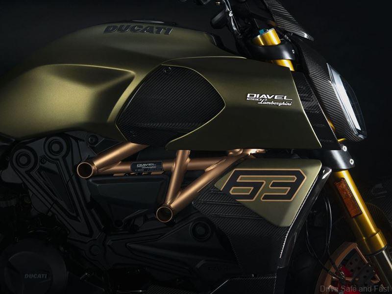 Ducati Diavel 1260 Lamborghini 는 람보르기니 시안(Sian) FKP 37 의 특징을 담은 슈퍼바이크인데, 두카티와 람보르기니 모두 폭스바겐 그룹의 브랜드이긴 하지만,이와 같은 협업은 처음이었다. 두카티 디아벨 1260 이 단 630대만 만들어지는 이유는 모델 명인 1260을 반으로 나눈 숫자이며, 람보르기니 시안에서 영감을 받아 장착된 골드 휠은 단조 휠로 경량화를 꾀했고, 카본파이버로 만들어진 에어인테이크와 라디에이터 커버 역시 람보르기니를 연상시키게 한다.