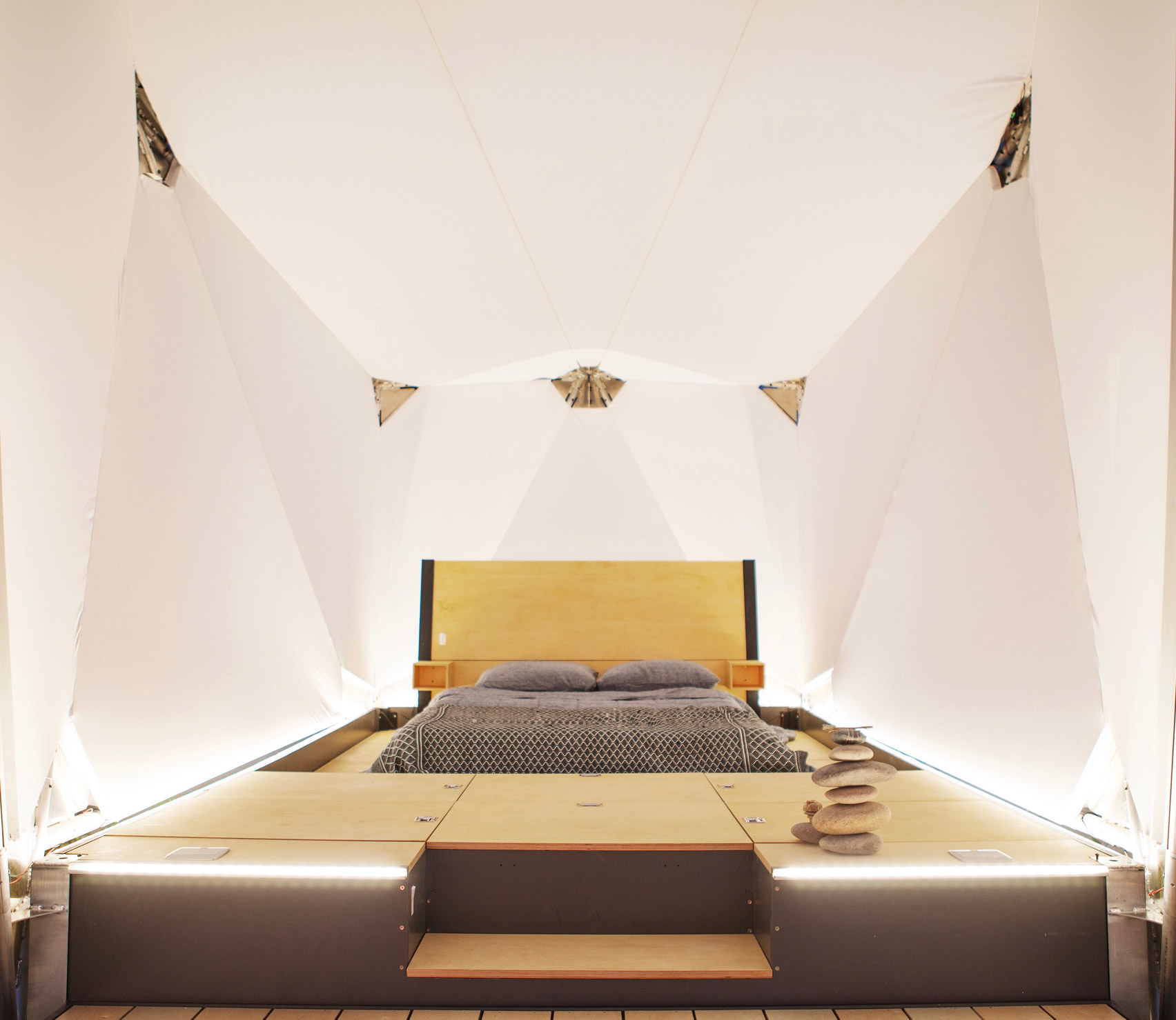 Jupe 는 독립형 배터리와 태양광 전기판, Wi-Fi 라우터와 전기 콘센트 등이 매립된 모듈러 타입의 텐트로, 기둥은 알루민윰이며, 천막은 파이어시스트(Firesist) 패브릭을 활용해 야광 빛을 낸다고 한다. 그리고, 약 3평 정도의 공간으로 퀸사이즈 침대 및 테이블과 의자 등도 포함되어 있으며, 이동성을 고려해 만들어진 만큼, 납작한 형태로 보관이 가능하다. 가격은 $17,500 정도로 한화 약 2천만원 정도이며, 현재 Jupe.com 에서 프리오더를 진행하고 있다고 한다.