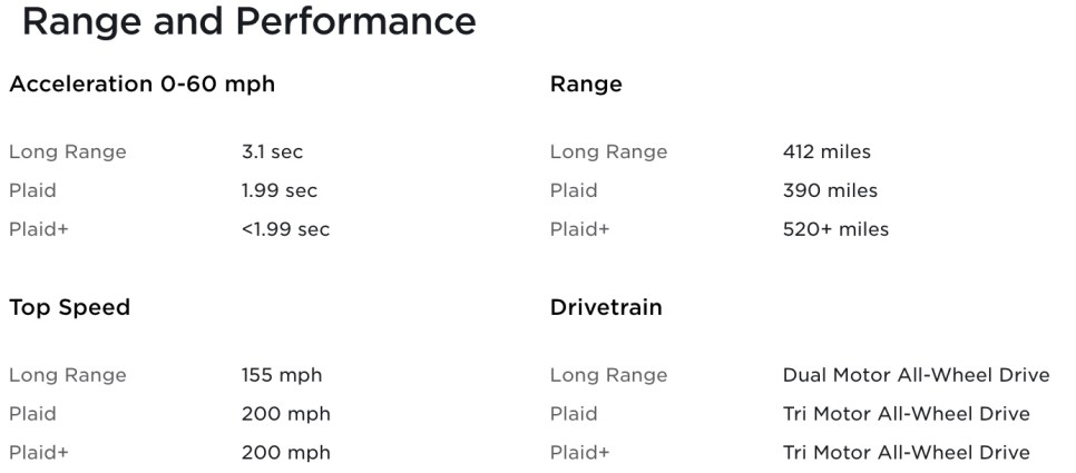 플레이드는 제로백 1.99초에 최고 320km/h 의 성능을 보이며, 플레이드 플러스 모델은 830km 라는 엄청난 주행가능거리를 보여준다. 기존의 롱레인지 모델의 660km 과 비교하면 놀라운 성능이며, 가격도 놀랍다. 모델 S 플레이드는 11만 9,900 달러로 한화 약 1억 3천만원이며, 모델 S 플레이드 플러스는 13만 9천달러. 한화로 약 1억 5,600만원이다.