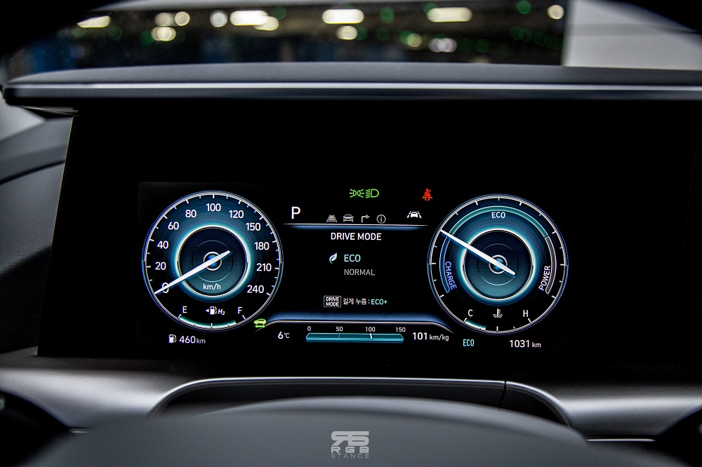 슬림한 통합형 디스플레이가 적용된 2021 넥쏘의 실내는 HUD(헤드업디스플레이) 를 제외하면 모든 기능들을 거의 다 갖추고 있다. 후측방 모니터와 자동주차기능, HDA와 ADAS 등이 있다. 다만, 컵홀더는 하나밖에 없다는 점이 좀 의아하긴 하다. 2021년형으로 바뀌면서 달라진 실내의 모습은 바로, 10.25인치의 디지털 클러스터다.
