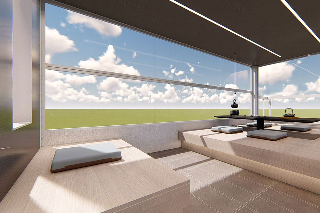 2층 공간은 그리 넓지는 않지만, 다양한 용도로 활용이 가능하다. 명상을 즐기거나, 휴식 등을 즐길 수 있는데, 2층 공간이 만들어지는 것도 특이하다. 접혀있던 유리가 펴지면서 2층 공간이 만들어지는 것이며, 유리는 불투명하게 제어할 수 있다고 한다. 그리고, 2층으로 이동하는 방법은 바로 '엘리베이터' 다.