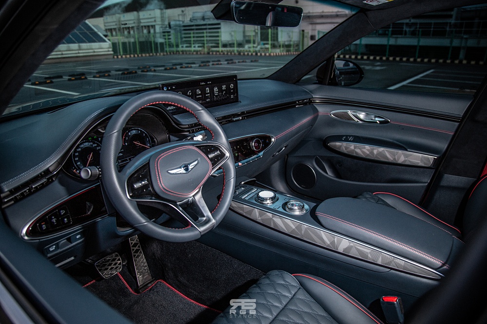 제네시스 GV70 은 역동적이면서도 우아한 모습 그대로다. 여기에 스포츠패키지 전용 프론트 범퍼와 G-Matrix 패턴의 21인치 휠과 다크크롬 가니쉬 및 대구경 배기구가 스포티함을 더해주는데, 기본적으로, 우아한 라인과 역동성의 조화로움이 매력적이다.