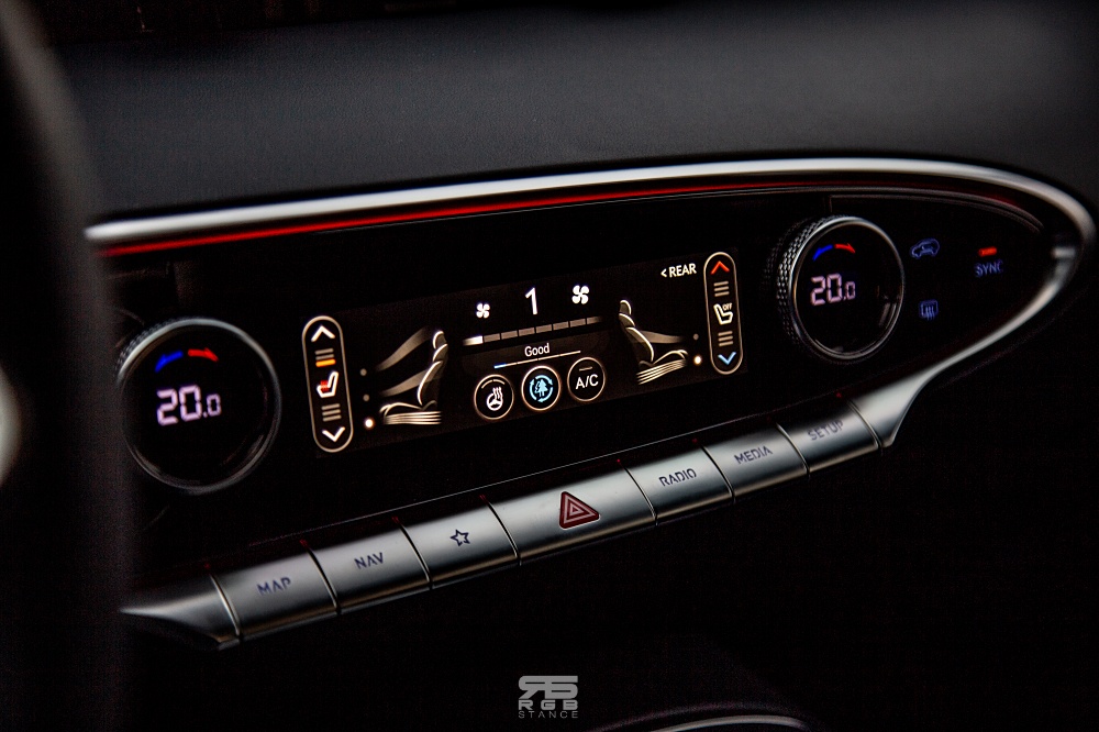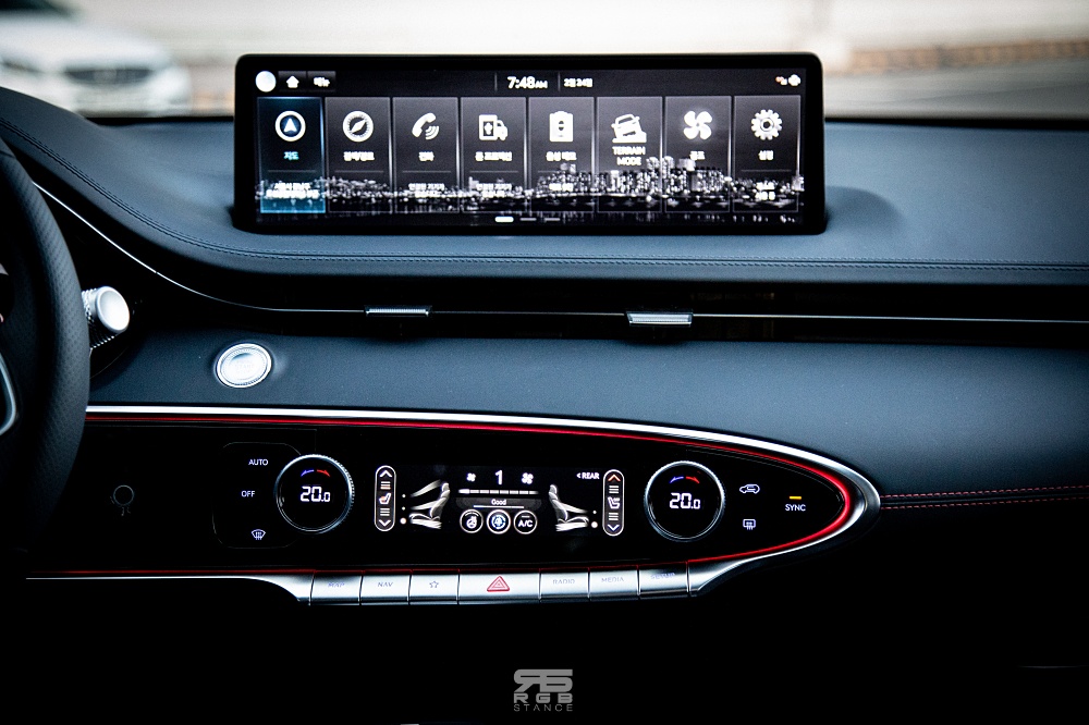 GV70 의 실내는 확실히 한국적인 여백의 미를 보여주고 있다. 슬림한 형태의 송풍구와 얇은 크롬 라인이 양쪽 문까지 이어져 탑승자를 감싸는 듯한 느낌을 주며, 깔끔한 실내공간은 꽤나 여유로운 편이다.