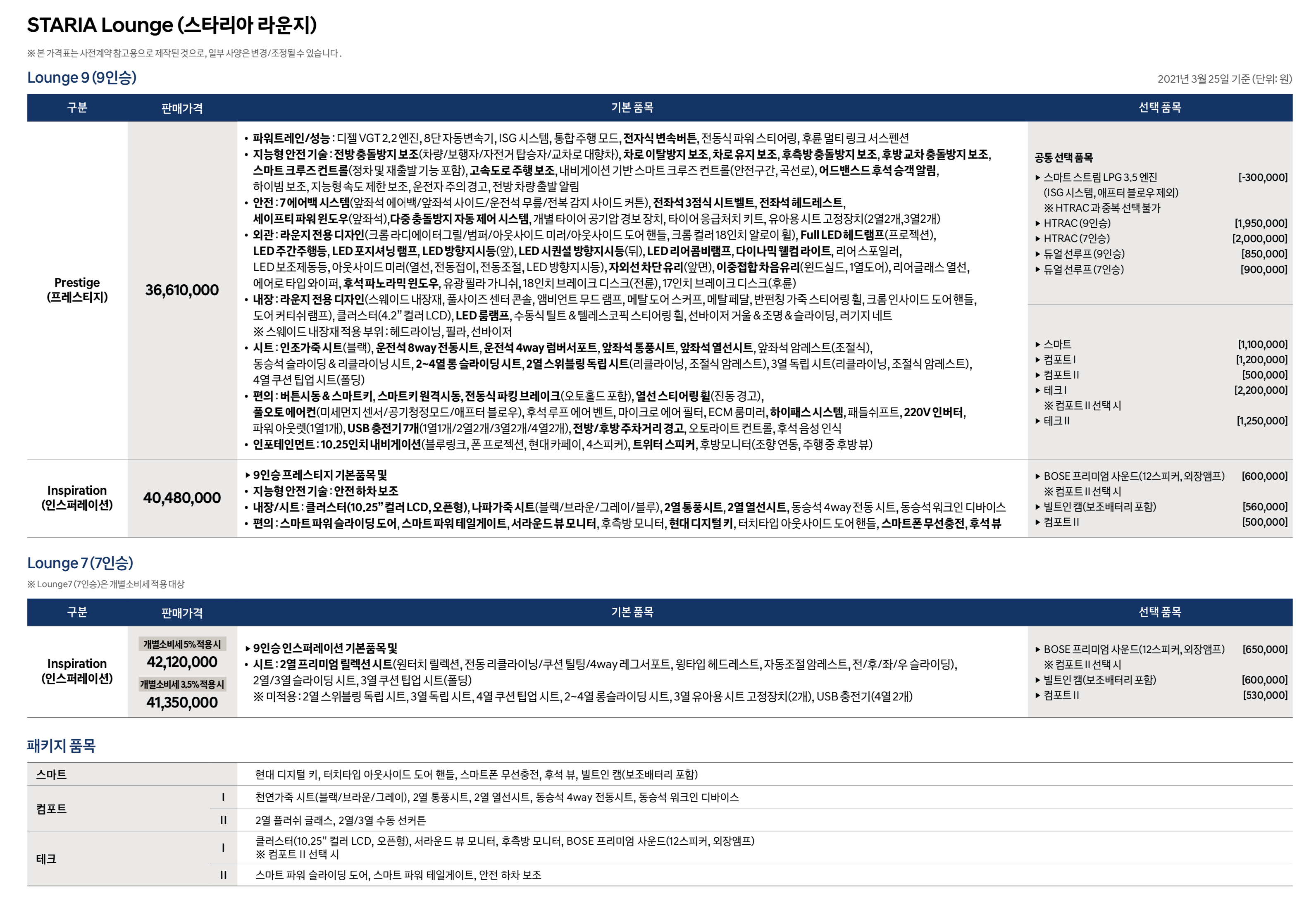 특히, 스타리아 라운지(7인승/9인승) 은 탑승자를 위한 라운지 전용 편의사양과 앰비언트 무드램프가 적용된 것과 7인승 라운지에는 엉덩이를 시트에 밀착시켜 척추의 균형을 바로잡는 프리미엄 릴렉션 시트가 탑재되어있다. 이 외에도 9인승 라운지 트림에는 2열 시트를 180도 회전이 가능한 스위블링 시트(Swiveling Seat) 가 적용되어 2열 및 3열 탑승승객이 서로 마주보고 대화할 수 있어서 의전용 및 비즈니스 용으로도 충분히 활용 가능하다. 그리고, 2.2 디젤엔진과 8단자동변속기, ISG 시스템, 전자식 변속버튼, 스마트 크루즈 컨트롤, 어드밴스드 후석 승객알림, 하이빔 보조, 7에어백 시스템 등이 기본으로 들어가 있다.