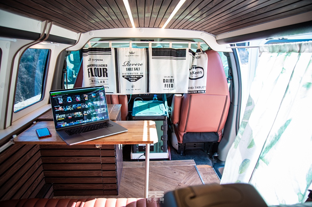 익스프레스 밴은 풀사이즈밴으로, 최대 15인승까지 시트 배열이 가능해 해외에서는 여행 가이드용으로도 많이 사용되곤 한다. 하지만, 이 캠퍼밴은 1열과 3열 시트만 남기고 개조되었으며, 1열 시트는 회전까지 가능해 테이블을 사이에 두고 서로 대화를 나누기에도 충분하다. 화장실만 없을 뿐이지, 웬만한 원룸만한 여유로운 사이즈를 보여준다.