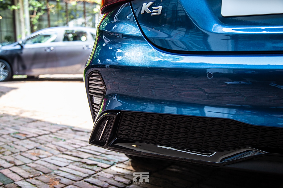 더 뉴 K3 의 후면부를 보면, 가로지향적 디자인에 입체감을 살렸고, 테일램프 역시 헤드라이트와 마찬가지로 속도감을 형상화한 것과 함께, 리어 디퓨져의 형상 역시 스포티하게 바뀌었다.