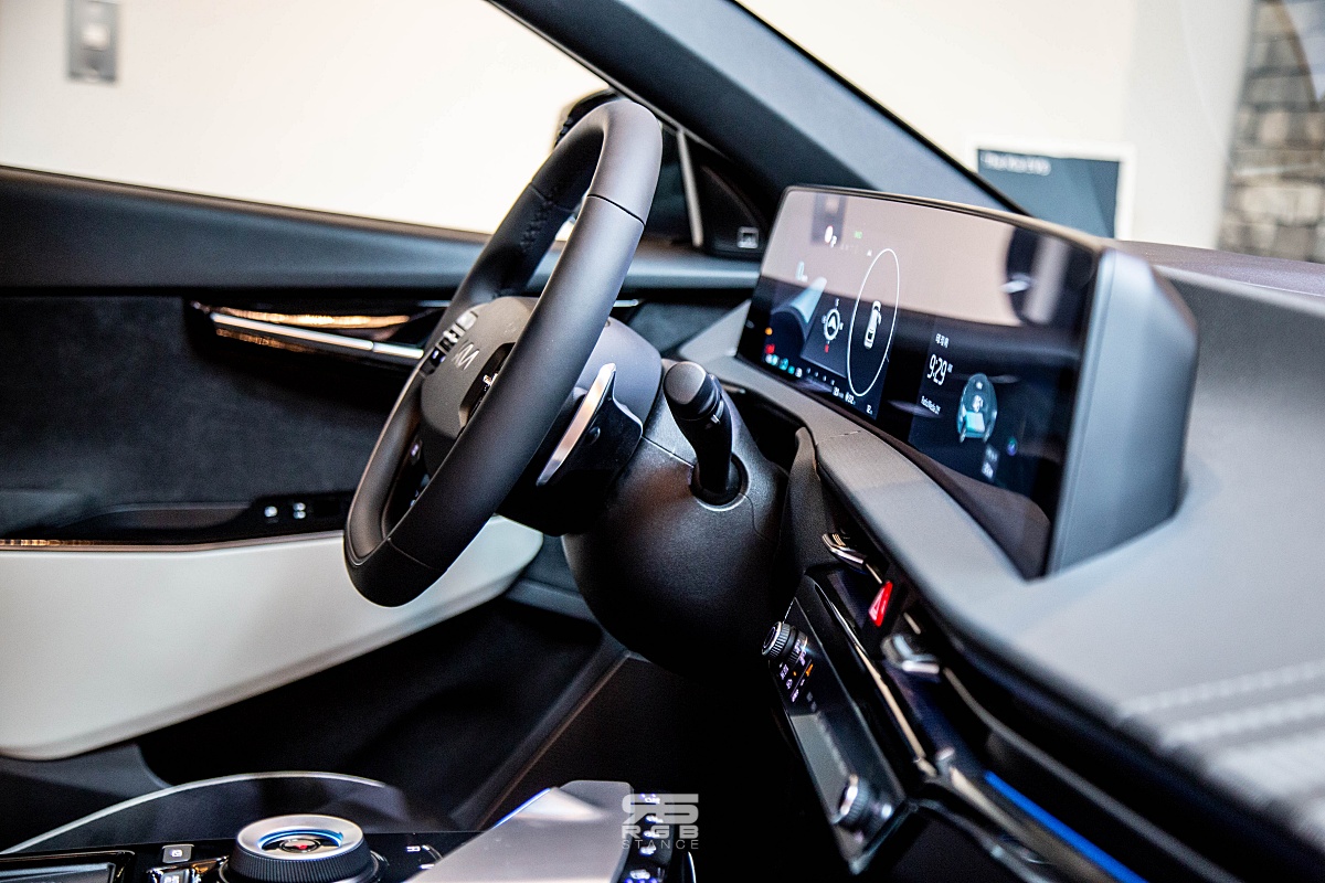 EV6 GT 의 실내를 보면, D 컷 스티어링 휠과 함께 스포츠 버킷시트 및 도어트림과 콘솔, 시트에 네온 컬러 스티치가 인상적이며, 이외의 레이아웃은 동일하다.