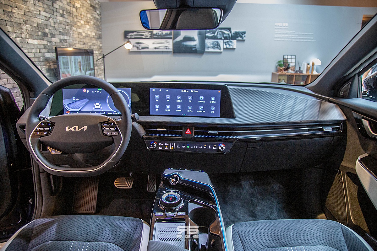 EV6 는 GT 와 GT Line 모두 비슷한 느낌이다. 가장 눈에 크게 들어오는 것은 바로, 운전석 중심의 와이드한 파노라믹 커브드 디스플레이다. 슬림해진 대시보드와 함께 실내가 더욱 넓어보이게 하며, 센터콘솔은 떠 있는 듯한 모습에 미래지향적 모습을 보여주는데, K8 과도 같은 모습이어서 익숙하고, 적응이 쉬워보인다. 무엇보다 통풍시트/열선시트 를 바로 제어할 수 있다는 점이 아이오닉5와 차이가 나며, 커브드 디스플레이가 고급감을 높여준다. 하지만, 센터콘솔을 앞뒤로 이동시킬 수 없어, 실내 공간의 활용성에서 아이오닉5와 EV6 는 지향점 자체가 다르다는 점을 알 수 있다.