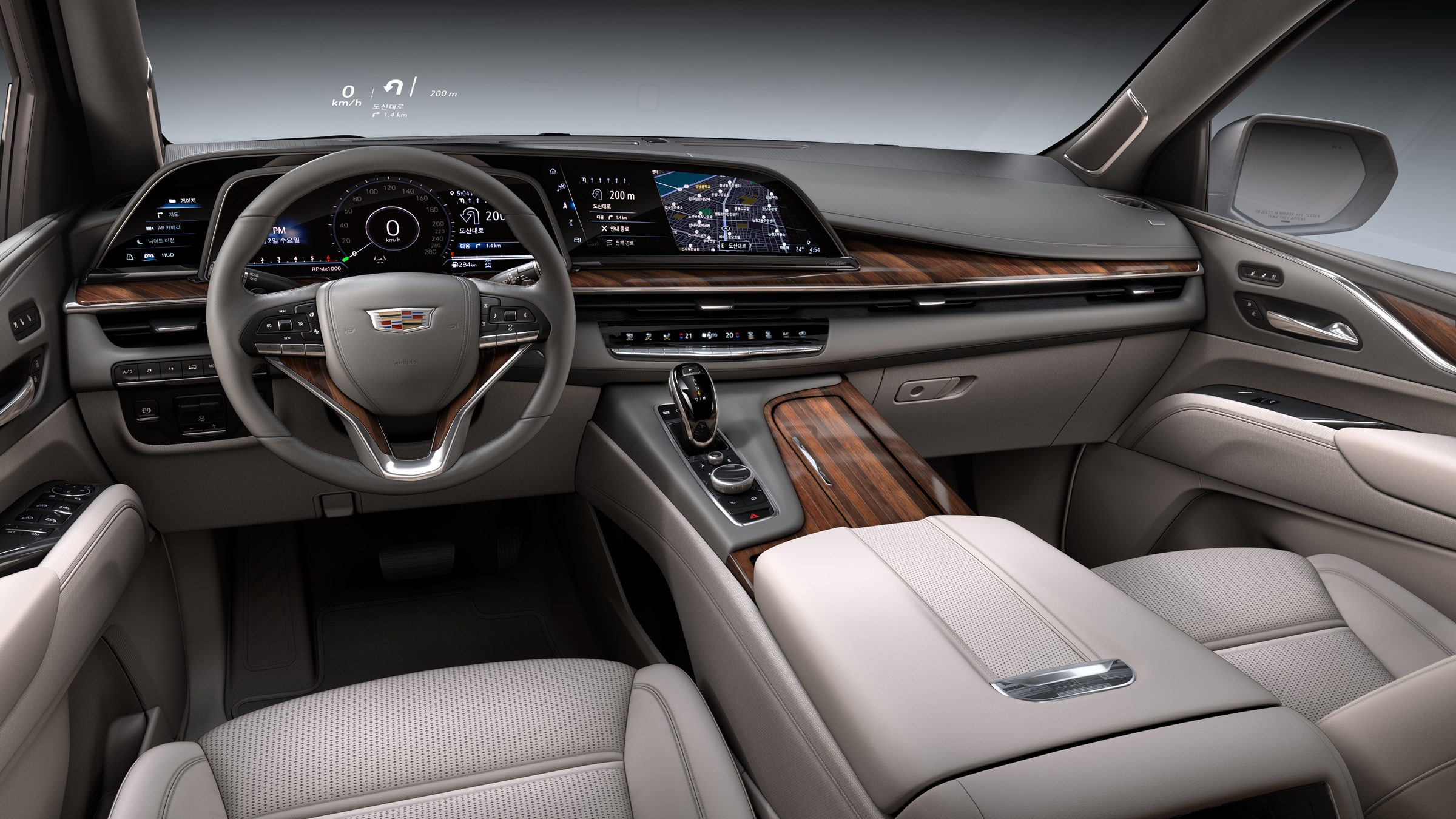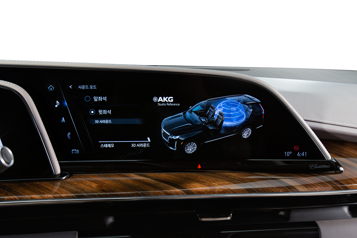 그리고, 업계 최초로 AKG 스튜디오 레퍼런스 사운드 시스템이 적용되어 역대 캐딜락 중 최고의 음향 퀄리티를 보여주는데, AKG 는 세계 정상급 뮤지션들이 애용하는 마이크와 헤드폰을 제작하는 곳으로, 36개의 실내 스피커를 통해 뛰어난 음질의 사운드를 더욱 정교하게 표현해준다. 이 외에 증강현실 내비게이션과 나이트비전, 운전석에서 3열까지 원활한 커뮤니케이션을 도와주는 컨버세이션 인핸스먼트 시스템(Conversation Enhancement System)과 마사지 기능이 적용된 파워시트, 냉장 및 냉동까지 가능한 콘솔 쿨러 등 다양한 테크놀로지와 편의사양이 적용되어 있다. 그리고, 2열에서는 12.6인치의 고화질 터치스크린이 있으며, HDMI 및 C 타입의 USB 포트를 사용할 수 있다.