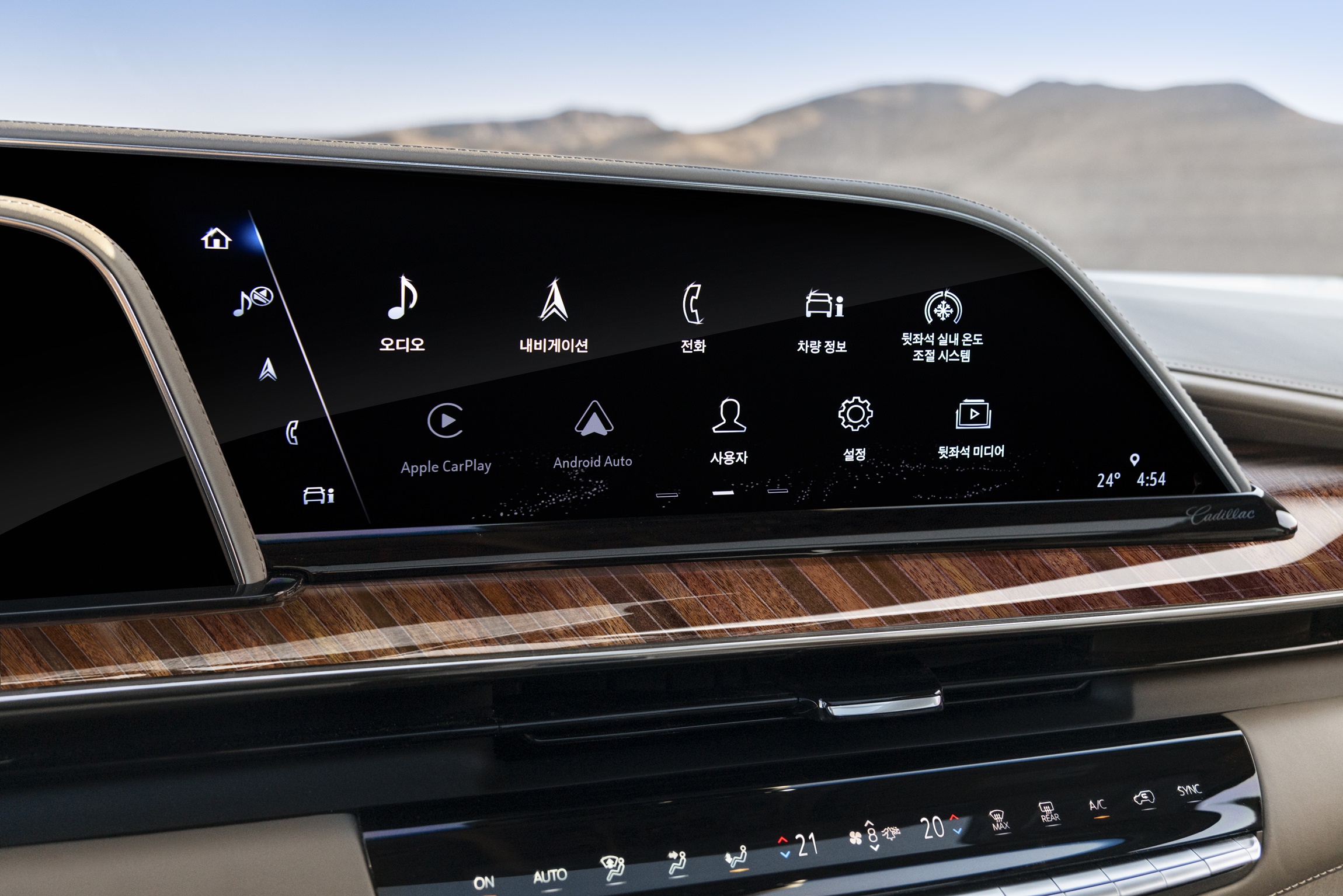 그리고, 첨단 기술들이 적용된 디자인 레이아웃이 신형 에스컬레이드 진화의 핵심인데, 세계 최초로 적용된 38인치 LG 커브드 OLED 디스플레이가 4K 급 화질을 제공해 뛰어난 비주얼 퀄리티를 제공해주고, 세가지 영역으로 구분되어 각 영역에서 차량에 대한 모든 기능을 제어할 수 있도록 도와준다.