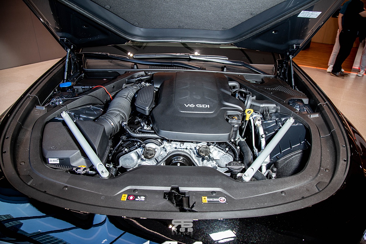 3.8 가솔린과 3.3 가솔린 터보 모델이 전시되어 있는데, 3.8 가솔린 모델은 315마력, 40.5kg.m 의 토크를 보여주고, 3.3 가솔린 터보 모델은 370마력에 52.0kg.m 의 토크를 보여준다. 3.3 가솔린 터보모델의 경우에는 흡기라인쪽 강화를 해놓아 초반 가속응답성을 빠르게 해놓은 것이 눈에 띄였다.