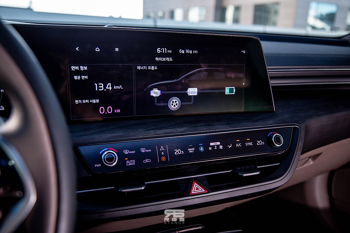 실내로 들어오더라도 K8 하이브리드 사이의 차이를 느끼긴 힘들다. 고급스러운 파노라믹 커브드 디스플레이와 인포테인먼트/공조 전환버튼, 전자식 변속 다이얼, 나파가죽 퀼팅 시트 등은 편안하고 쾌적함을 느끼게 해준다. 그리고, 외부에서 낯설음을 느꼈다면, 실내는 익숙함이 느껴진다.