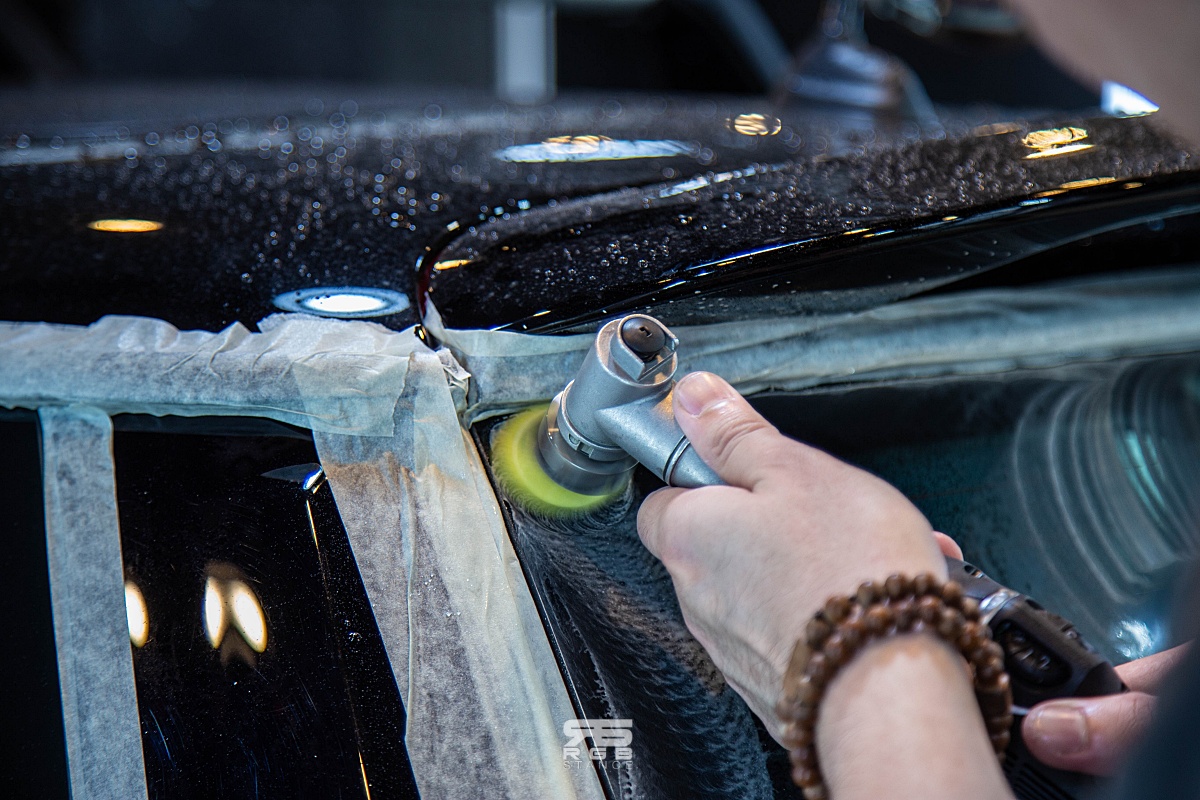 유막제거작업은 전문 약재와 기구를 사용해 진행된다. 우선, 기본적인 세차를 하고, 도장면에 손상이 없도록 마스킹 작업을 꼼꼼하게 해준 다음, 유막제거 약재를 기계를 사용해 유막제거에 들어간다. 너무 많은 힘을 주어서도 안되고, 적당한 힘으로 유막제거를 해주는데, 틈새의 작은 부분은 전용 공구를 사용해 남아있는 유막을 모두 제거해준다. 참고로, 토크렌치처럼 생긴 이 작은 기기는 루페스 빅풋이라는 장비로, rpm 컨트롤이 되며, 국내 몇대 없는 장비라고 한다. Rpm 조절이 필요한 이유도 시공 부위에 따라서 다르게 써야 하기 때문이다.