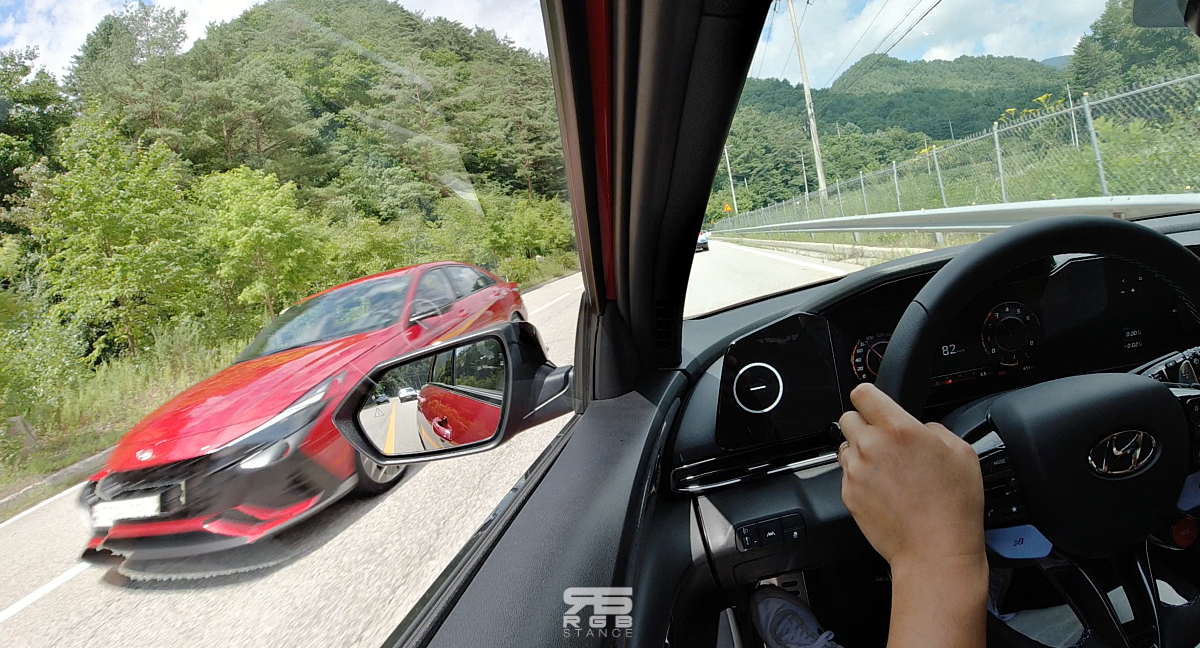 우선, 아반떼 N 타고 공도를 주행해봤다. 공도주행을 통해 일상에서의 편안한 승차감을 놓치지는 않았는지 확인을 해보았는데, WRC 랠리카에 적용되어 있는 액슬 일체형 기술을 적용한 전륜 기능통합형 액슬(IDA, Integrated Drive Axle) N 최초로 적용된 것과 함께, 조인트와 허브의 일체화로 무게를 줄여 더욱 날렵한 핸들링 감각을 보여주며, 현대차 최초로 전륜 서스펜션에 듀얼 컴파운드 인슐레이터를 적용해 핸들링은 물론, 승차감과 NVH 에서 뛰어난 성능을 보여주었다.