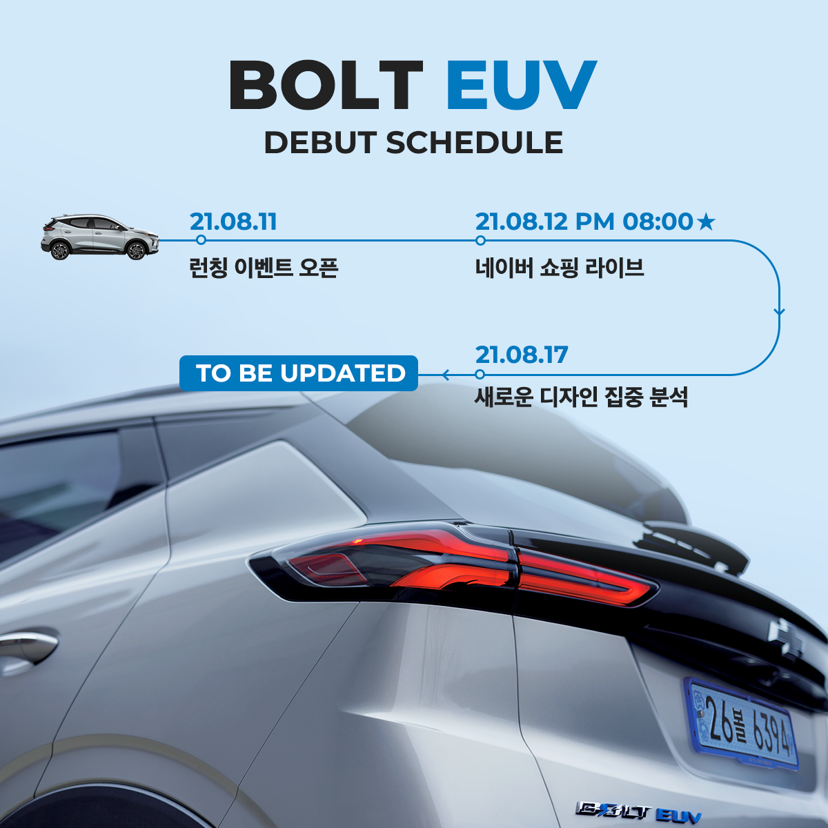 쉐보레(Chevrolet) 가 SNS 계정에 볼트 EUV 의 런칭 일자를 공개했다. 8월 11일 런칭 이벤트 오픈과 함께 8월 12일에는 네이버 쇼핑라이브를 하고, 8월 17일에는 새로운 디자인에 대한 소개를 하는 컨텐츠 스케쥴을 공개했는데, 경쟁사들의 전기차 출고가 지연되고 있는 만큼, 쉐보레 EUV 에 관심들이 집중되고 있다.