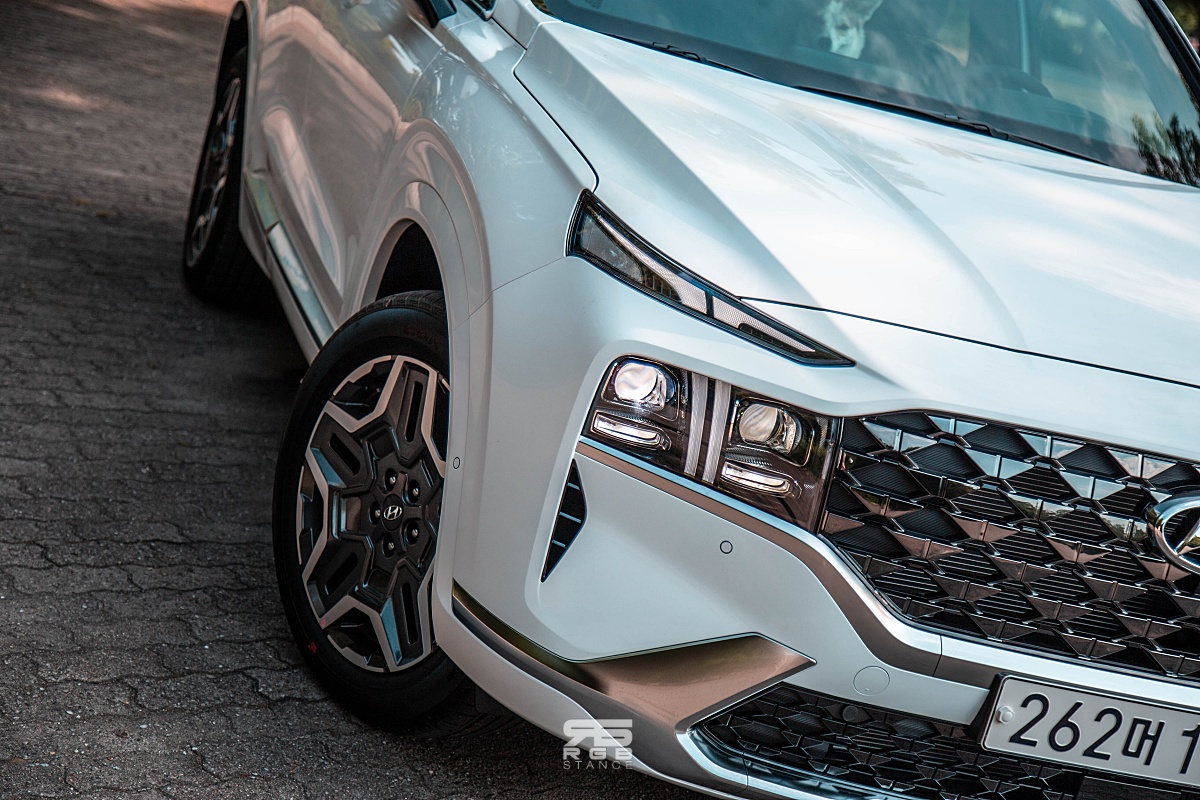 싼타페 하이브리드는 요즘 신차들이 많이 나오는 지금 보면, 평범해 보인다. 하지만, 부드러우면서도 강인한 인상을 주는 라인이 도심형 SUV 다운데, 기존의 싼타페와 큰 차이가 없다. T 자형 LED DRL 과 수평구조의 프론트그릴. 다크 크롬 라디에이터 그릴 등이 눈에 띈다.