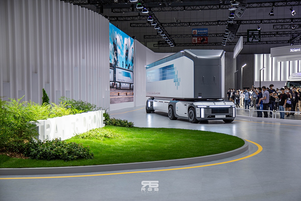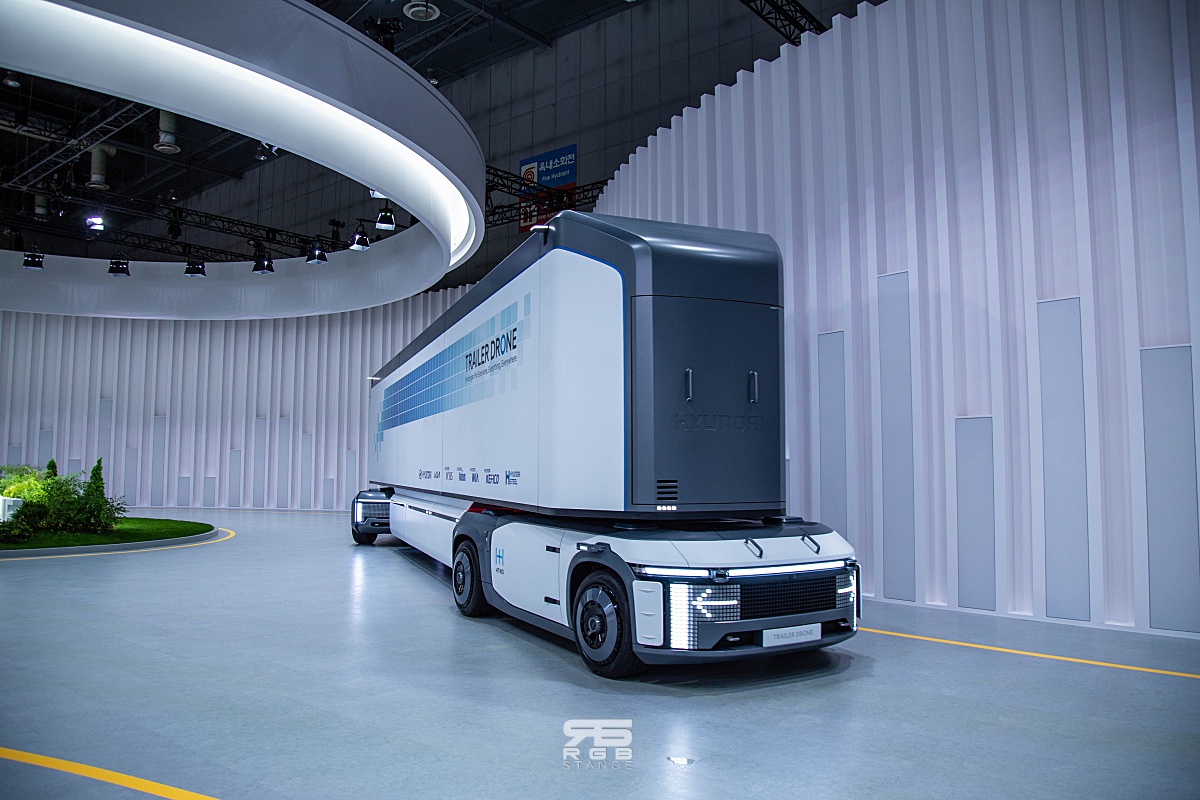 그리고, 엑시언트 수소전기트럭 및 이동형 수소충전소 등 이미 선보인 차량들의 소개도 있었지만, 눈에 띄는 것은 트레일러 드론이었다. 장거리 물류 이동을 위한 트레일러 기능을 무인으로 수행할 수 있는 미래 운송시스템인 트레일러 드론은 보기(Bogie) 2대를 전후에 적용해 회전반경을 최소화하고 등판능력을 확대한 한편, 운전자가 필요없기 때문에 화물 적재 능력 역시 크다. 트레일러 드론은 화물운송 외에도 소방이나 건설현장, 항만, 공항 등에서도 그 활용도가 높으며, 차별화된 기능을 수행하기에 충분해 보인다.