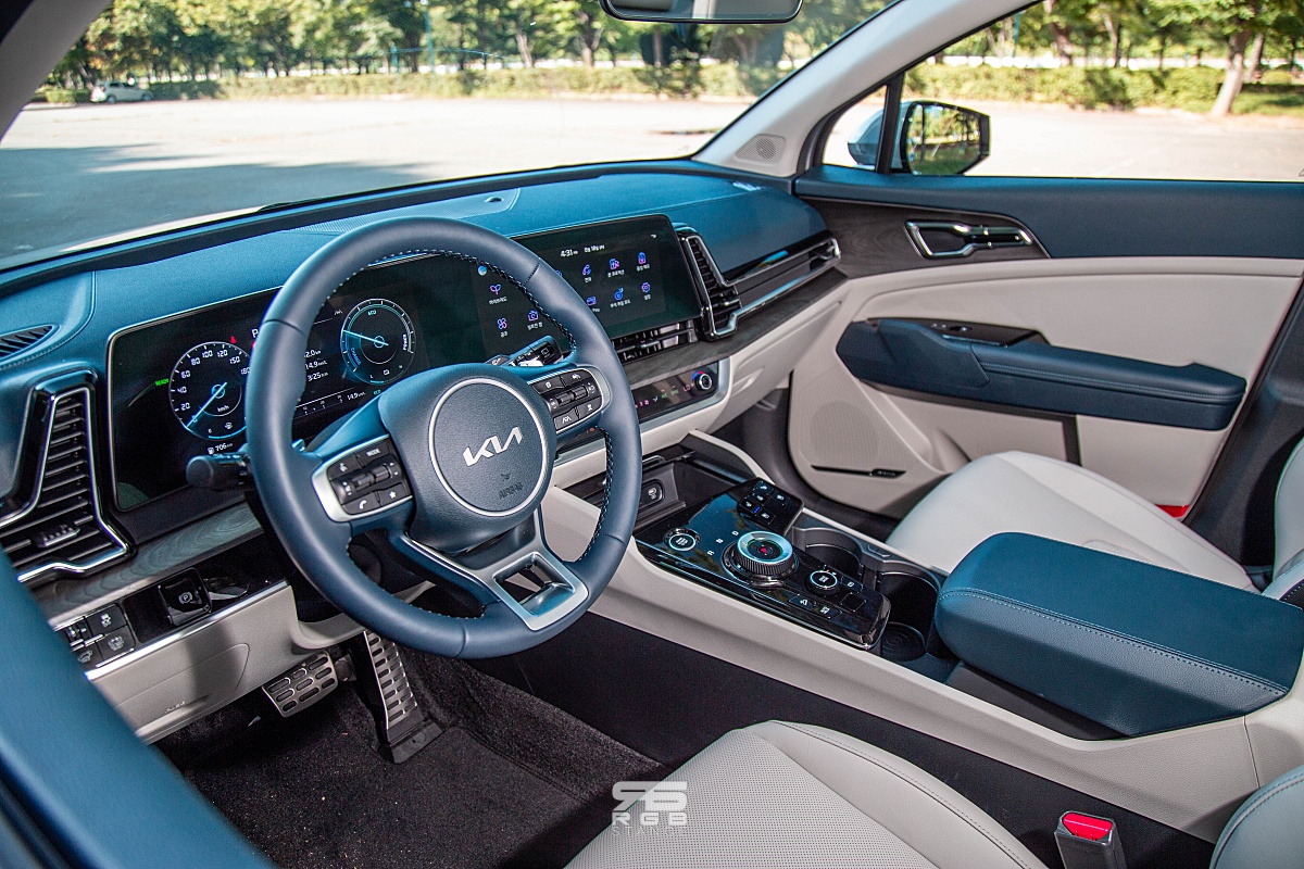 스포티지의 실내로 들어와보면, 심플한 듯 상당히 과감한 모습을 보여준다. 하이브리드 전용 컨텐츠가 탑재된 스포티지 하이브리드의 실내는 차급을 뛰어넘는 요소들이 가득하며, 공간은 상당히 혁신적이다.