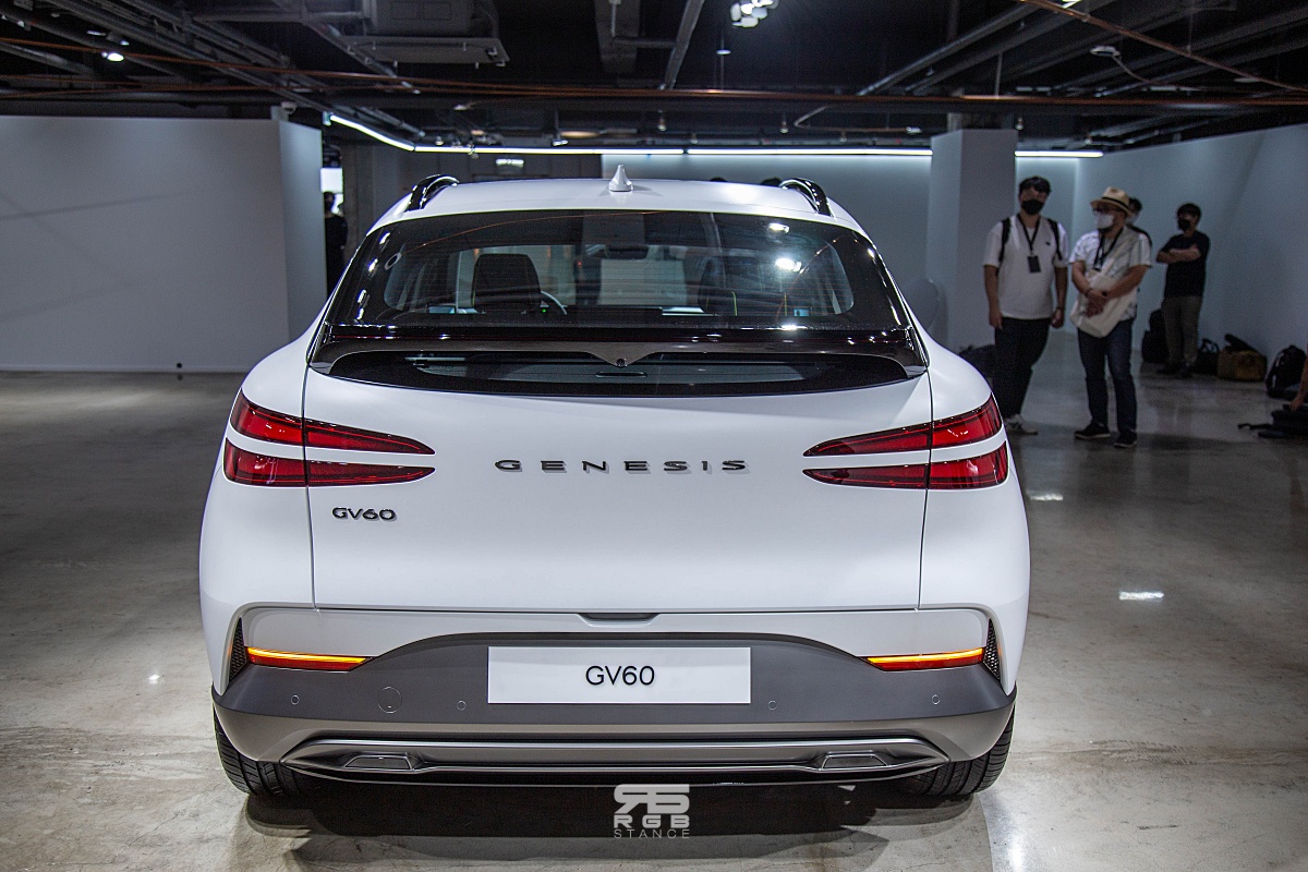엣지가 살아있는 모습보다는 볼륨감을 중시한 모습의 GV60 은 본넷과 휀더 부분을 하나의 패널로 구성한 ‘클램쉘(Clamshell)’ 을 적용하여 깔끔한 이미지를 보여주고 있으며, 윈드 쉴드 글라스로부터 윈도우 라인 상단을 따라 크롬 라인이 EV 이미지를 형상화 한 C 필러 가니쉬까지 독특하다. 그리고, 사이드의 도어 손잡이는 오토플러시로 디지털 사이드 미러, 전동식 충전구와 함께 첨단의 이미지를 강조하고 있다. 리어를 살펴보면, 두줄의 리어 콤비램프가 스포티하면서 리어 윙 스포일러가 역동적인 모습을 연출하고 있다.
