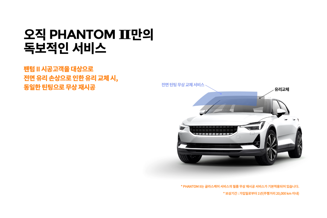 바로, F96 팬텀(팬텀II) 시공 고객 모두에게 ‘글라스케어 서비스’ 를 기본 제공하는데, 전면 유리 파손 시 틴팅 재시공 항목이 무상으로 적용되어 스톤칩이나 외부 충격으로 인해 전면 유리를 교환하게 될 경우에 본인이 비용을 지불하는 것이 아니라, 무상으로 전면 틴팅 교체 서비스를 레이노 대리점에서 제공받을 수 있다고 한다. 정말 독보적인 서비스다.