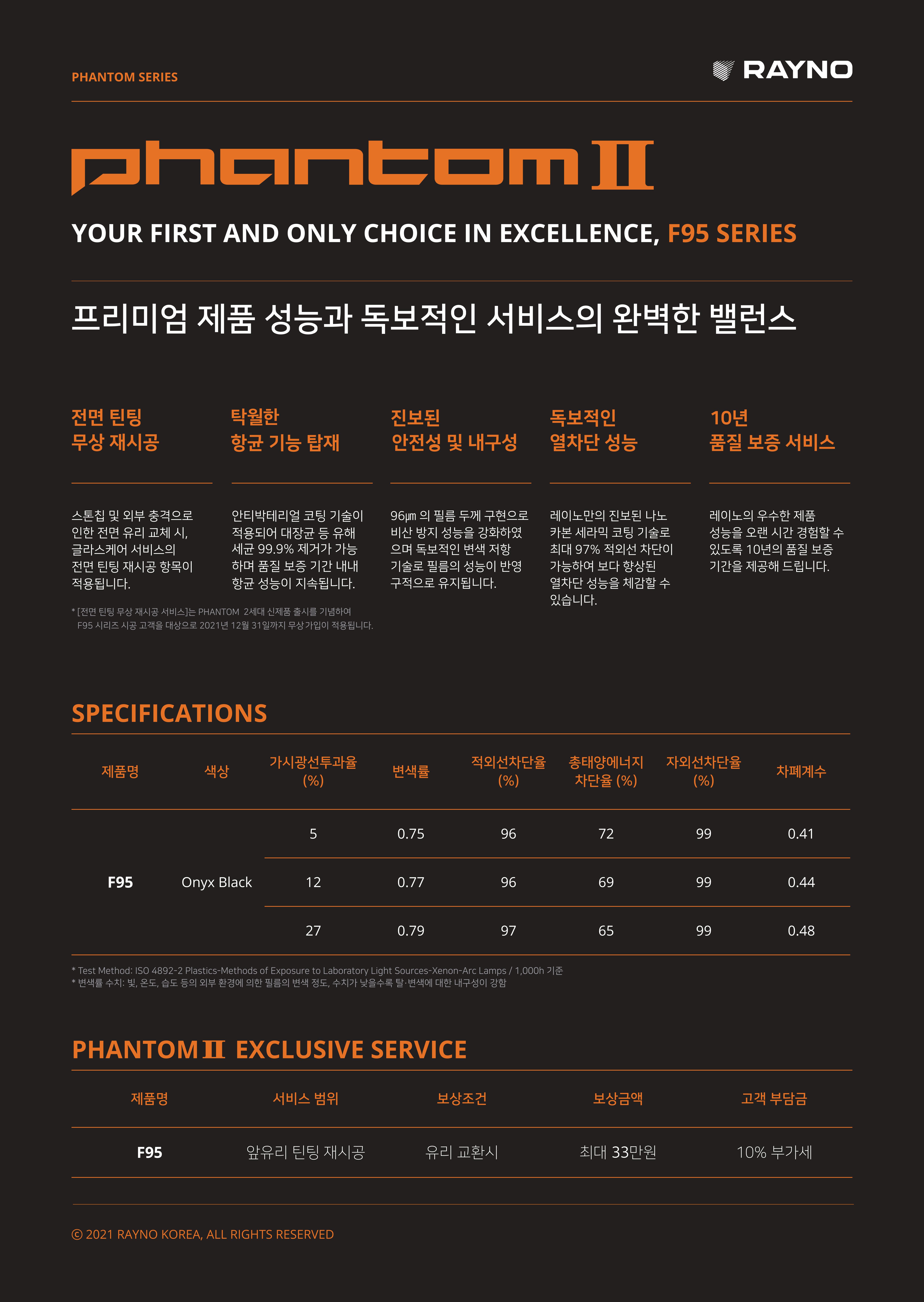 바로, F96 팬텀(팬텀II) 시공 고객 모두에게 ‘글라스케어 서비스’ 를 기본 제공하는데, 전면 유리 파손 시 틴팅 재시공 항목이 무상으로 적용되어 스톤칩이나 외부 충격으로 인해 전면 유리를 교환하게 될 경우에 본인이 비용을 지불하는 것이 아니라, 무상으로 전면 틴팅 교체 서비스를 레이노 대리점에서 제공받을 수 있다고 한다. 정말 독보적인 서비스다.