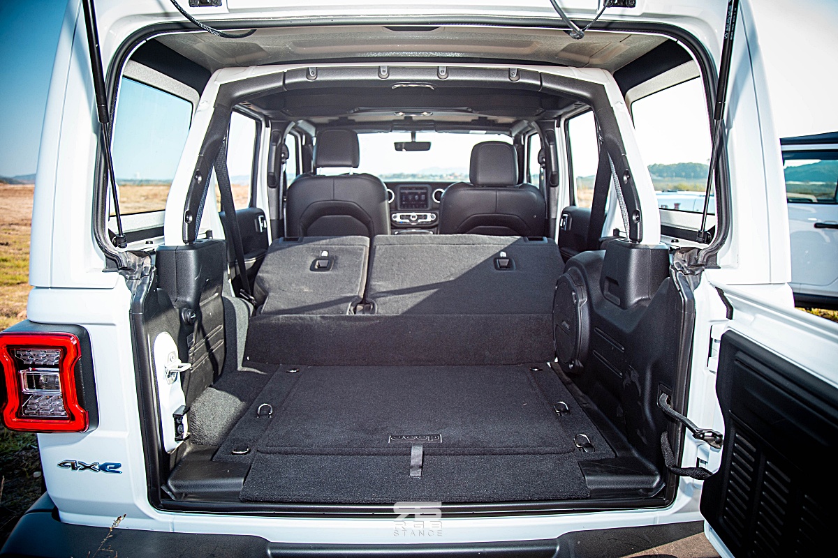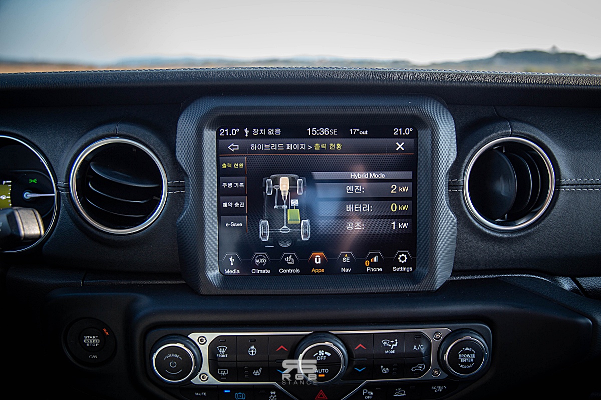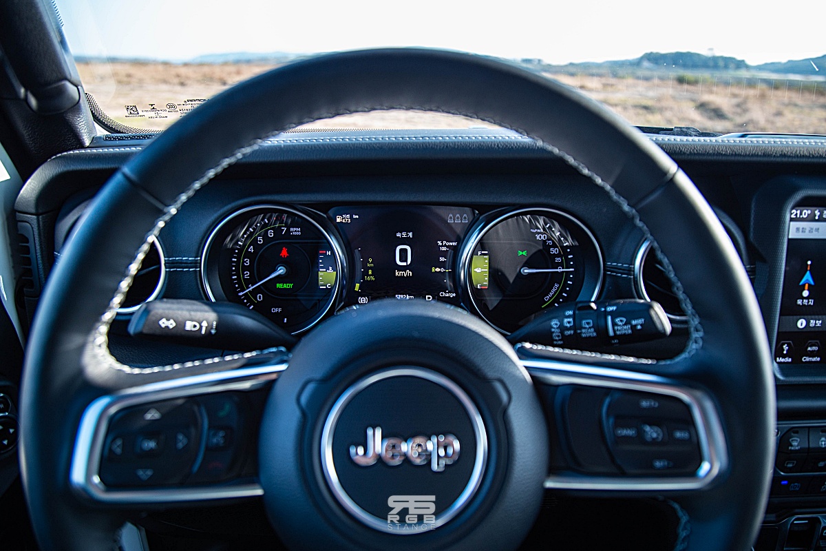 오버랜드로 만들어진 루비콘에 편의장비 및 고급스러움을 살짝 더한 4xe 는 미세하게 서스펜션이나 타이어, 기어비에서 약간의 차이를 보여준다. 일단 2.0리터 DI Turbo PHEV 엔진으로 272마력, 40.8kg.m 의 토크의 출력에 2개의 전기모터를 더해 총 380마력, 64.0kg.m 의 토크를 보여주며 8단 자동변속기를 사용하고, Selec-Trac 풀타임 4WD 구동방식을 사용하고 있다. 15.2kWh용량의 배터리와 전기모터를 사용하는 PHEV 인 만큼, 전기모터로만 32km 의 거리를 주행할 수 있다는데, 실제 주행을 해보면 친환경 차량이 맞는지 살짝 고개를 갸우뚱하게 된다.