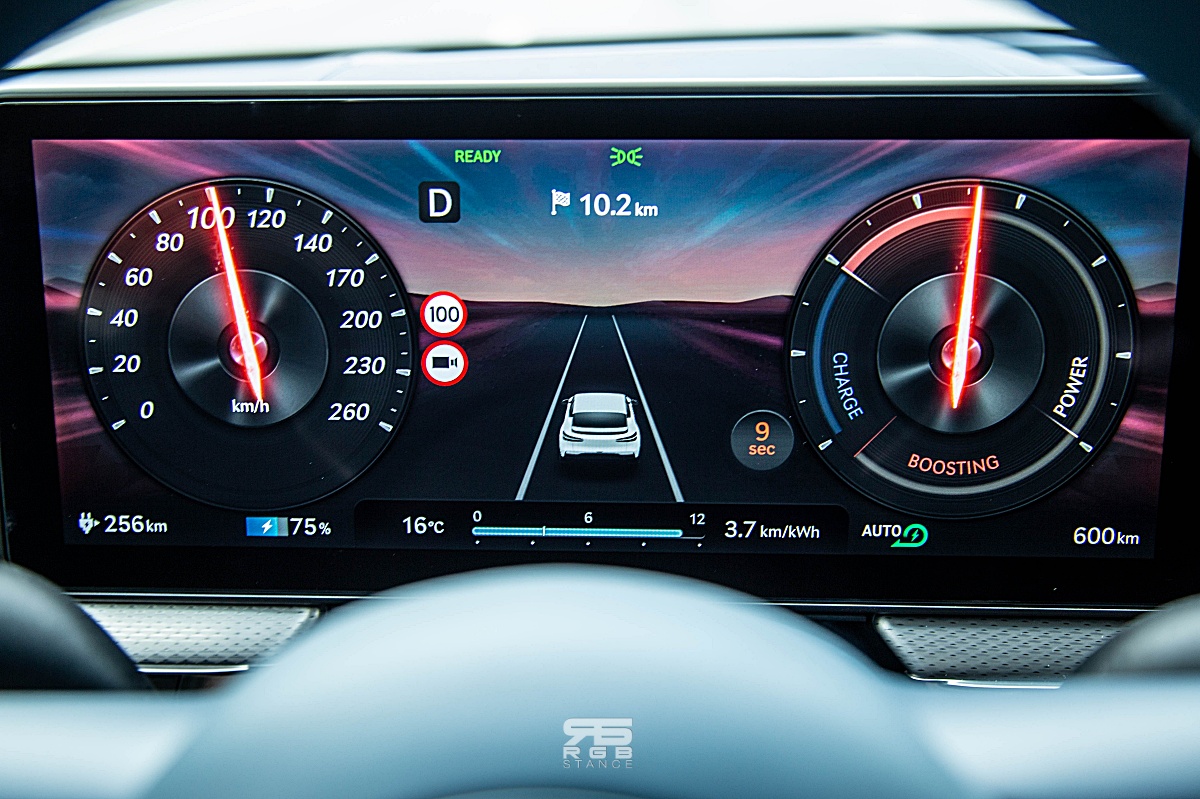 그냥 조용히 주행을 하다가 악셀에 조금 힘을 주면 폭발적으로 튀어나간다. 전형적인 전기차의 모습이다. 그런데, 스포츠 모드로 놓고 달리면, 더욱 과격하게 튀어나가는 모습은 스포츠카를 것처럼 뛰어난 가속력이 무서울 정도이다. 여기에 부스트모드를 사용하면 10초간 40kW(54마력) 정도 출력이 강해지며 제로백 4초의 가속력을 보여주는데, 계기판에서도 확실한 이미지 변화를 보여준다. 마치 영화 스타워즈에서 광속 진입하는 같은 그래픽이 인상적이다. 그리고, 10초의 카운트는 마치 사이버포뮬러를 연상케 하는데, 짜릿한 가속감에 자꾸만 부스트 버튼을 눌러보게 된다.