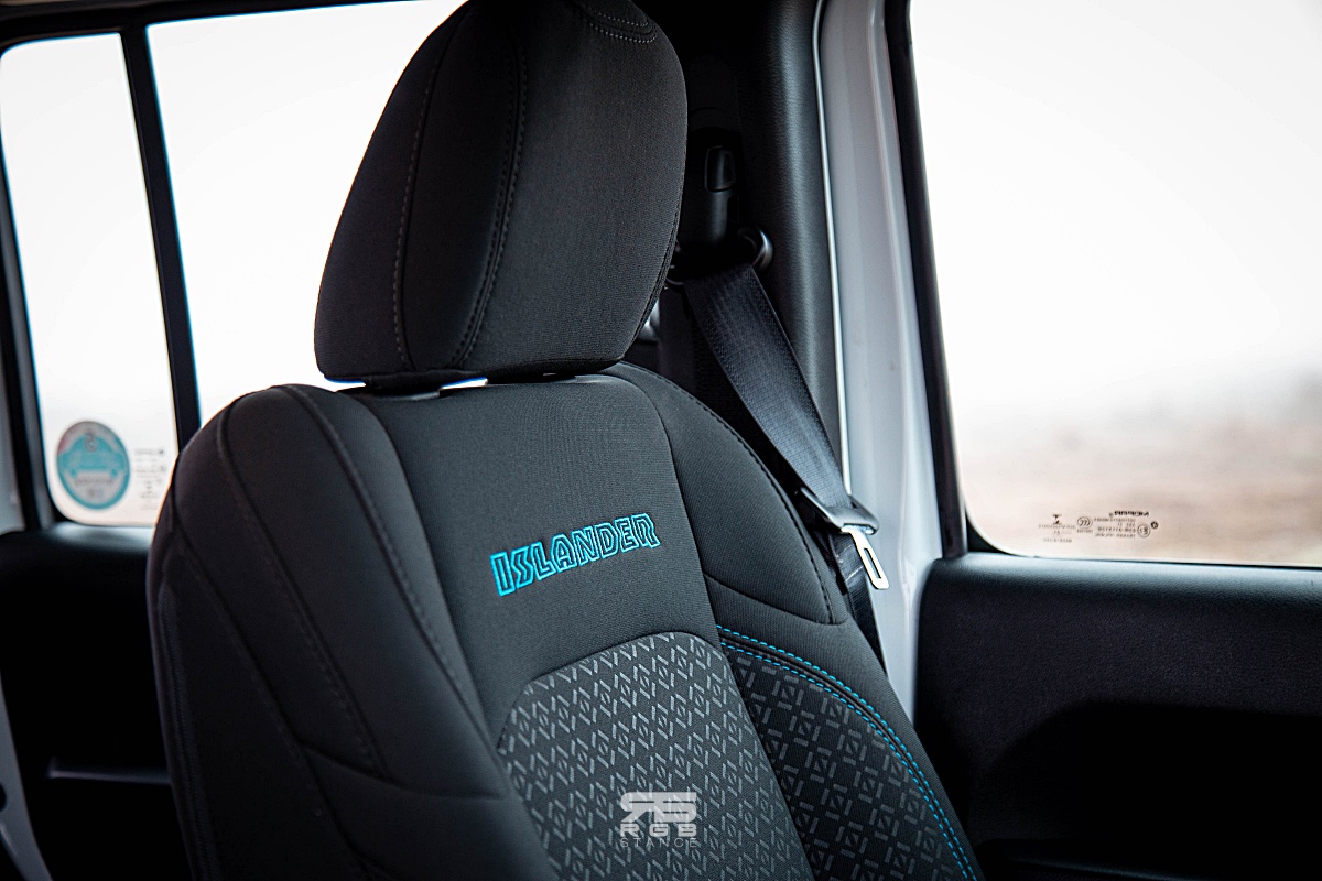 지프 아일랜더는 랭글러 4도어 스포츠를 베이스로 만들어졌다. LED 헤드램프와 테일램프, 오토 헤드램프 레벨링 시스템 등의 편의사양과 안전사양을 더해 경쟁력을 갖춘 아일랜더는 어떤 길이든 떠날 준비가 된 듯 보인다. 에디션 전용 모델답게 보닛에는 ‘ISLANDER’ 문구가 들어가 있으며, 트렁크 해치 스페어타이어 키트에는 익살스러운 티키 밥(Tiki-Bob)로고가 커다랗게 들어가 있다.