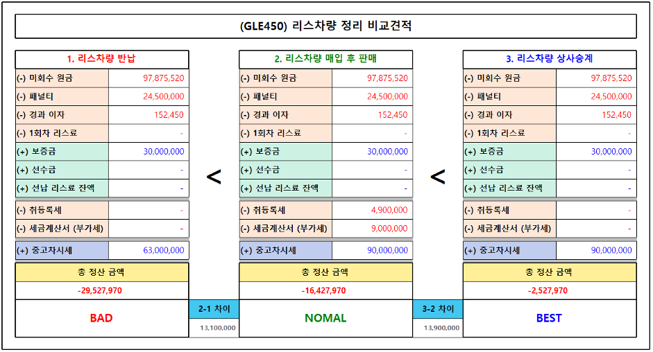벤츠 GLE 450 의 미회수 원금은 97,875,520 원에서 앞서 설명한 내용 중 첫번째인 리스회사로 차량을 반납하는 경우라면, 중고차 시세 6,300만원만 쳐주어서 총 2,9527,970 원을 뱉어내야 하는 상황이고, 리스차량을 고객이 매입 후 판매하게 된다면, 중고차 시세 9천만원을 쳐주지만, 취등록세로 490만원에 부가세 900만원을 빼고, 총 16,427,970원을 뱉어내야 한다.