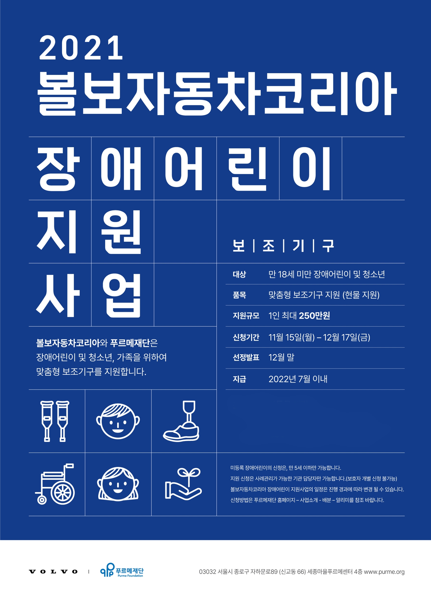 볼보자동차코리아(대표: 이윤모) 서울 송파 전시장에서 기증식을 갖고, 장애 어린이 지원사업 기금 3억원을 푸르메재단에 전달했다. 올해로 5 차를 맞이한 장애 어린이 지원사업은 누구나 건강한 사회 구성원으로 살아갈  있는 안전한 환경을 마련하고자 전개하고 있는 볼보자동차코리아의 사회공헌활동이다. 이를 위해 장애인들의 재활과 자립을 돕는 비영리재단인 푸르메재단과 2017 협약을 맺고, 매년 장애어린이 지원사업 기금을 후원해오고 있다.