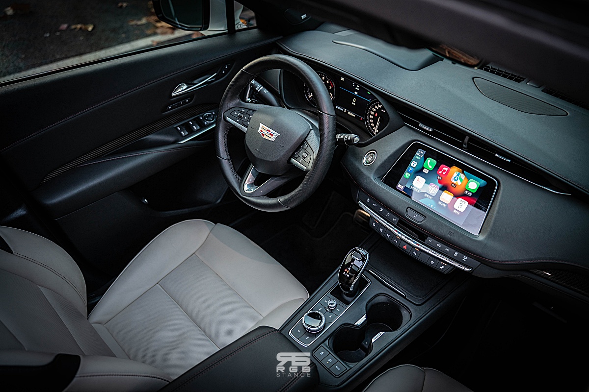 XT4 는 SUV 인데, 실내 구성은 마치 세단과 같은 느낌이다. 실내를 감싸는 가죽과 함께 카본파이버 장식이 스포티함과 고급스러움을 더해주는데, 아쉽게도 센터페시아에 위치한 플로팅 타입의 8인치 디스플레이를 보자마자 쉐보레 말리부가 생각났다. 캐딜락이 겪는 럭셔리 브랜드로서의 존재감이 부족한 이유 중 하나는 누구나 아는 GM 산하의 브랜드이긴 하지만, 너무 GM 의 냄새. 특히 쉐보레의 냄새와 흔적이 많이 보인다는 것이다. 스티어링 휠에서도 가죽의 느낌은 너무나 좋지만, 살짝 캐딜락만의 것이 아닌 GM 의 아이덴티티가 느껴지는 부분은 아쉽다.