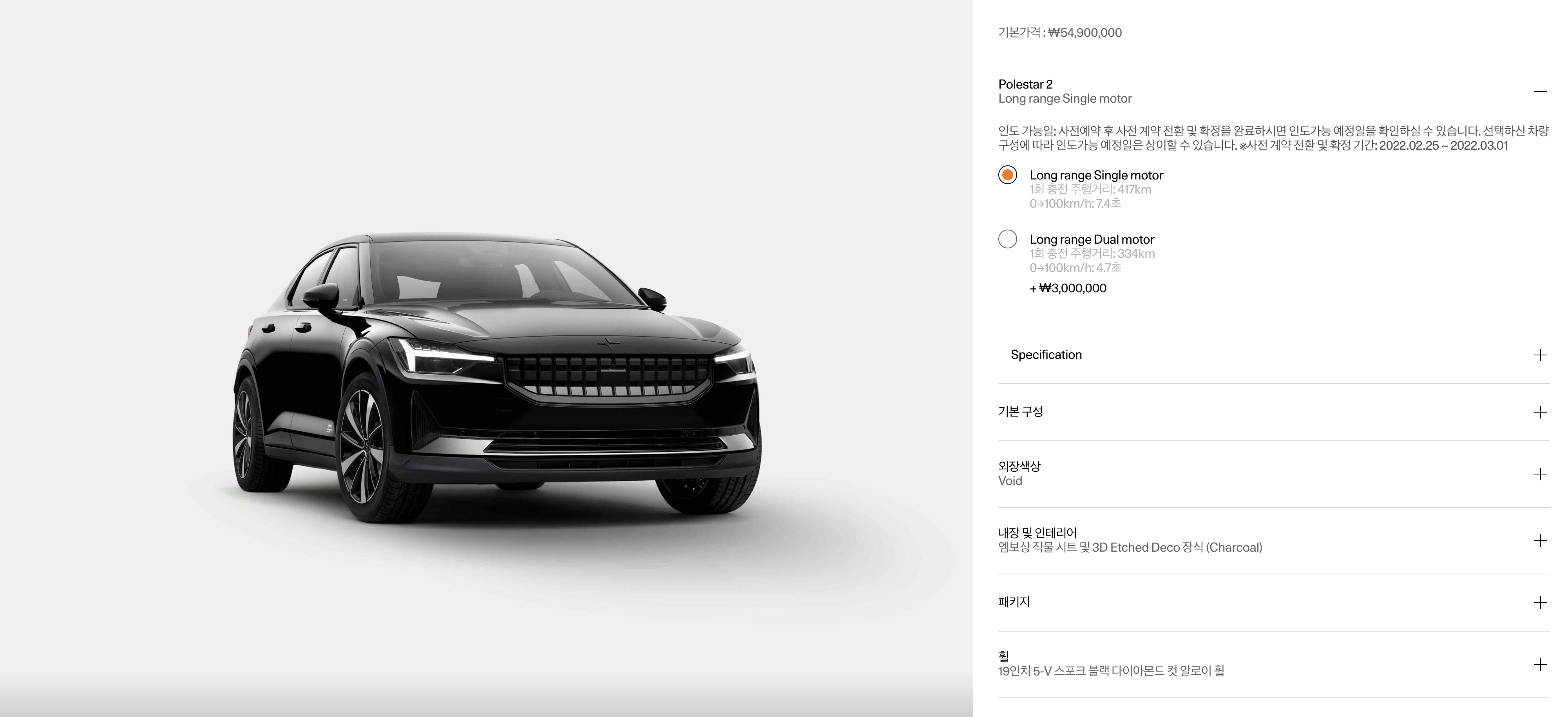 또한, 19인치 V형 5스포크 휠과 20인치 V형 4스포크 휠, 20인치 Y형 4스포크 휠을 비롯해 주행보조 기능이 포함된 파일럿 패키지와 강화 쇽업쇼버, 브레이크 시스템 등이 포함된 퍼포먼스 패키지 등 다양한 조합이 가능하며, 모든 조합을 다 더할 경우에는 7천만원이 넘는다. 이번 폴스타 2 사전계약은 2월 21일까지 진행되는데, 빠르게 받고 싶다면 사전계약이 답일 것 같다.