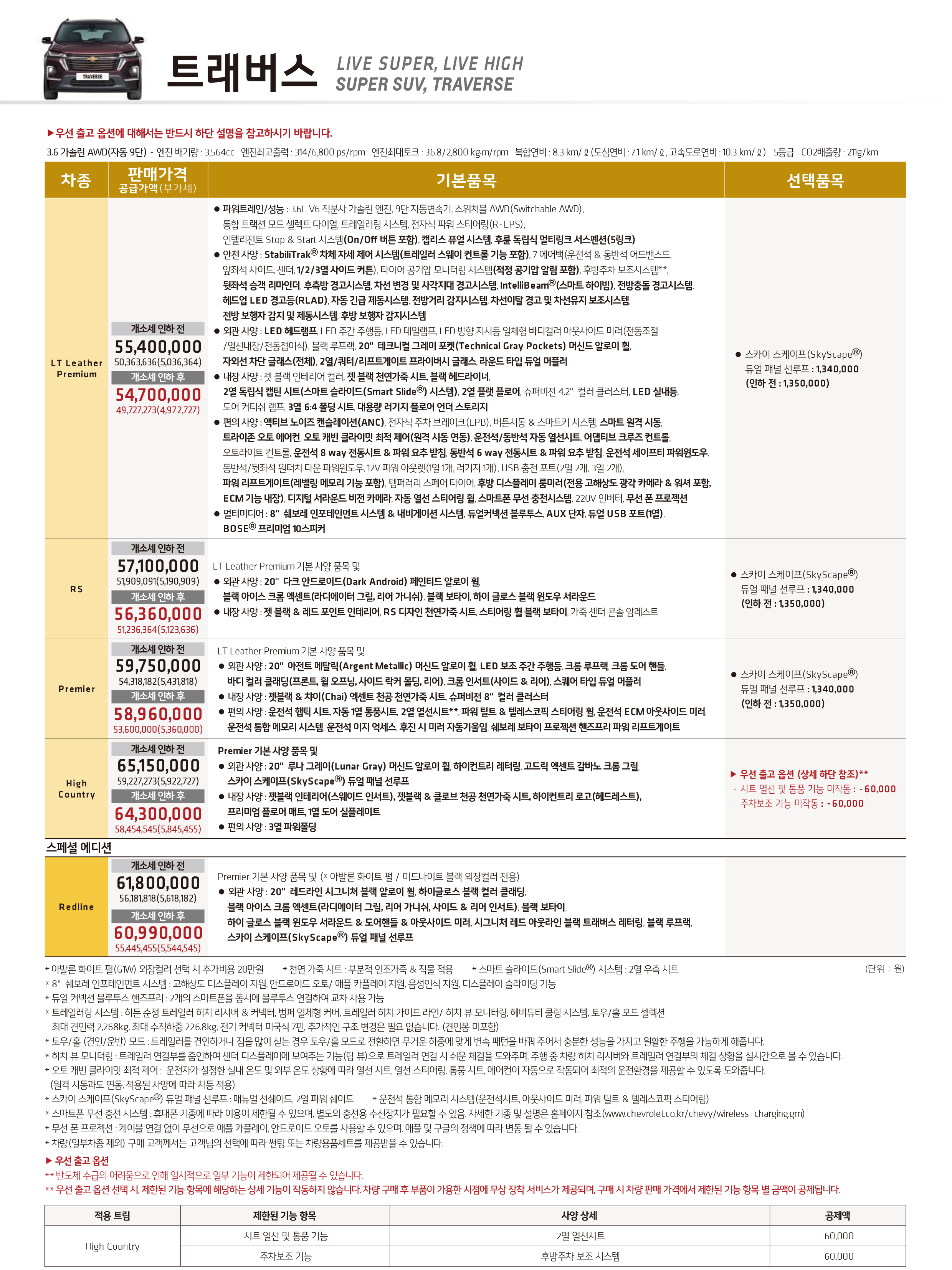 2022 트래버스 LT Leather Premium 은 5,470만원, RS 5,636만원, Premier 5,896만원, 하이컨트리 6,430만원이며, 프리미어 기본 사양에 레드라인 시그니처 블랙 알로이 휠 등을 추가한 스페셜 에디션은 6,099만원이다. 이 중 '하이컨트리' 트림만 우선 출고 옵션으로 다음달인 2월 9일 이후로 우선 출고되며, 다른 트림들은 6월달이 되어서 출고가 될 예정이다.