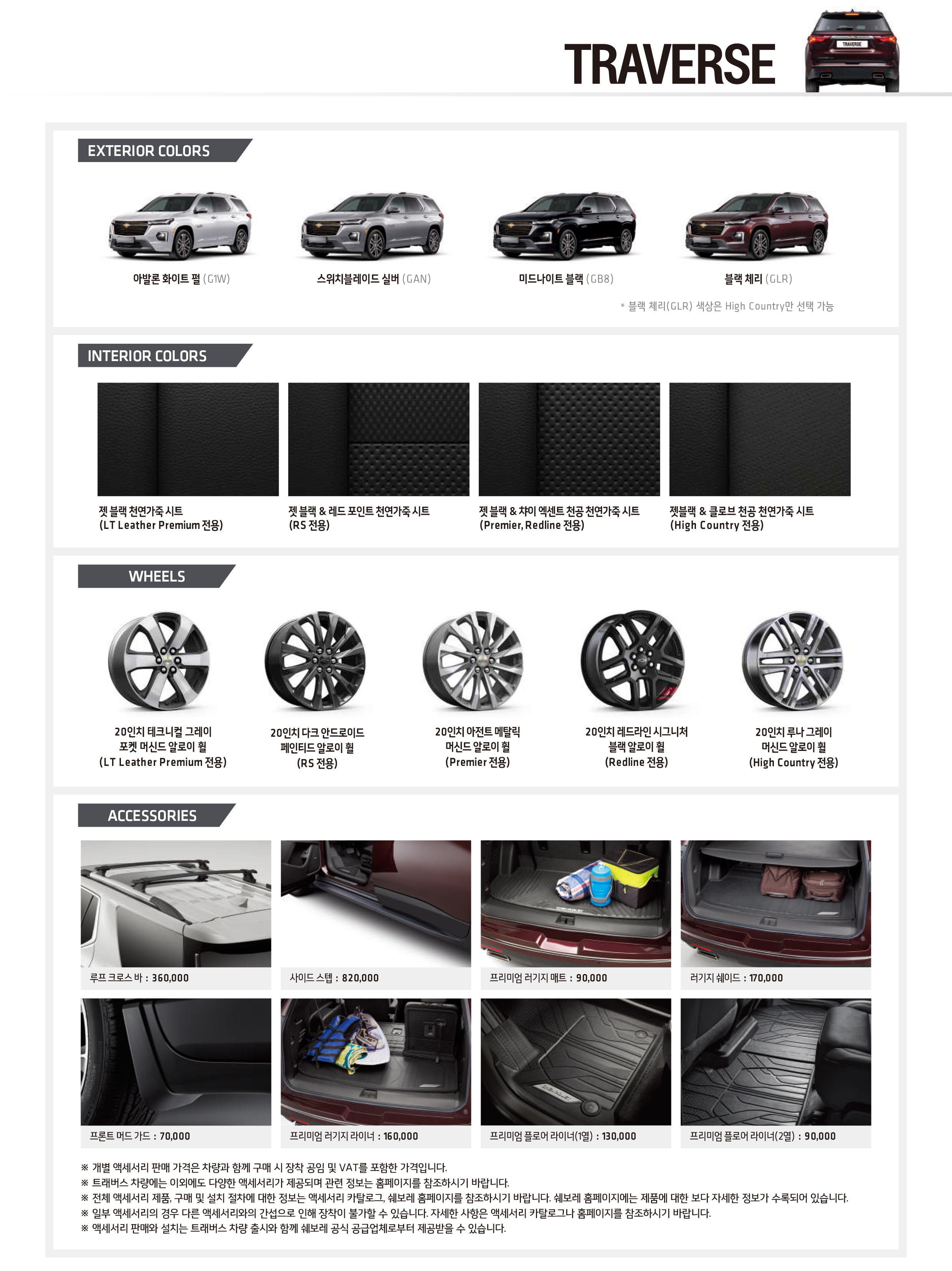 2022 트래버스 LT Leather Premium 은 5,470만원, RS 5,636만원, Premier 5,896만원, 하이컨트리 6,430만원이며, 프리미어 기본 사양에 레드라인 시그니처 블랙 알로이 휠 등을 추가한 스페셜 에디션은 6,099만원이다. 이 중 '하이컨트리' 트림만 우선 출고 옵션으로 다음달인 2월 9일 이후로 우선 출고되며, 다른 트림들은 6월달이 되어서 출고가 될 예정이다.