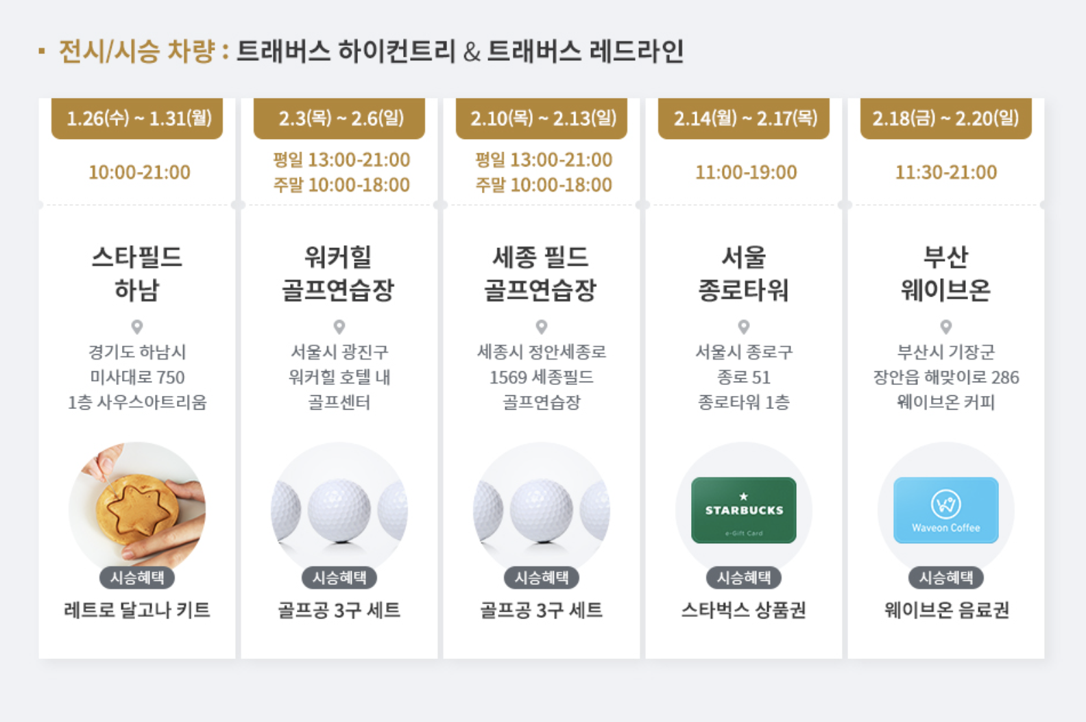 쉐보레는 1월 26일부터 1월 31일까지 스타필드 하남을 비롯해, 2월 3일~2월 6일 워커힐(광진구) 골프연습장, 2월 10일~2월 13일 세종 필드 골프연습장(세종시), 2월 14일~2월 17일 서울 종로타워, 2월 18일~2월 20일에 부산 웨이브온에서 차량을 전시하고 시승행사를 진행중이다. 또한, 홈페이지를 통해 견적 상담을 신청한 고객들을 대상으로 추첨을 통해 콜맨 캠핑 카트 등을 제공한다.
