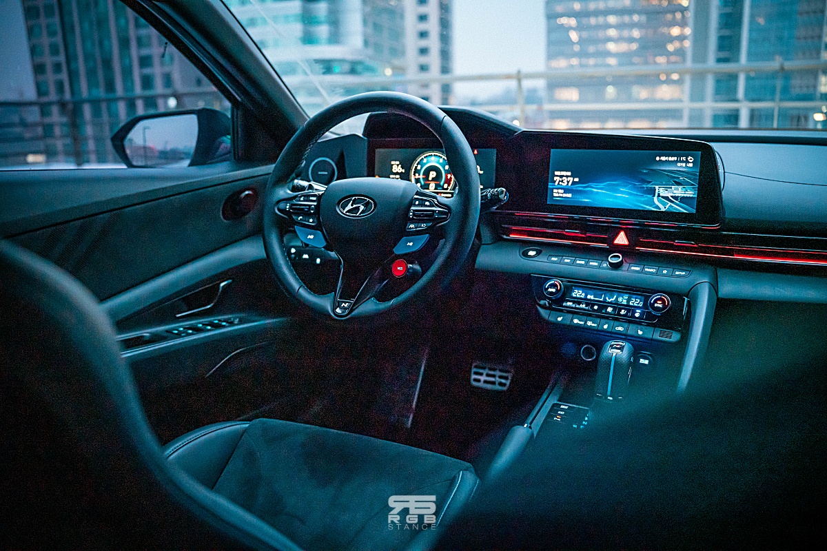 아반떼 N 의 실내는 더 과감하다. 인체공학적 설계를 통해 달리기를 제대로 즐길 수 있는 헤드레스트 일체형 버킷시트는 4점식 벨트를 장착할 수 있도록 되어 있고, 코너에서도 몸을 제대로 잡아주어 마음껏 차를 잡아돌릴 수 있게 도와준다. 여기에 N 로고에 조명이 들어오고 알칸타라 스웨이드 소재를 사용해 고급스러움과 함께 스포티함을 보여준다.
