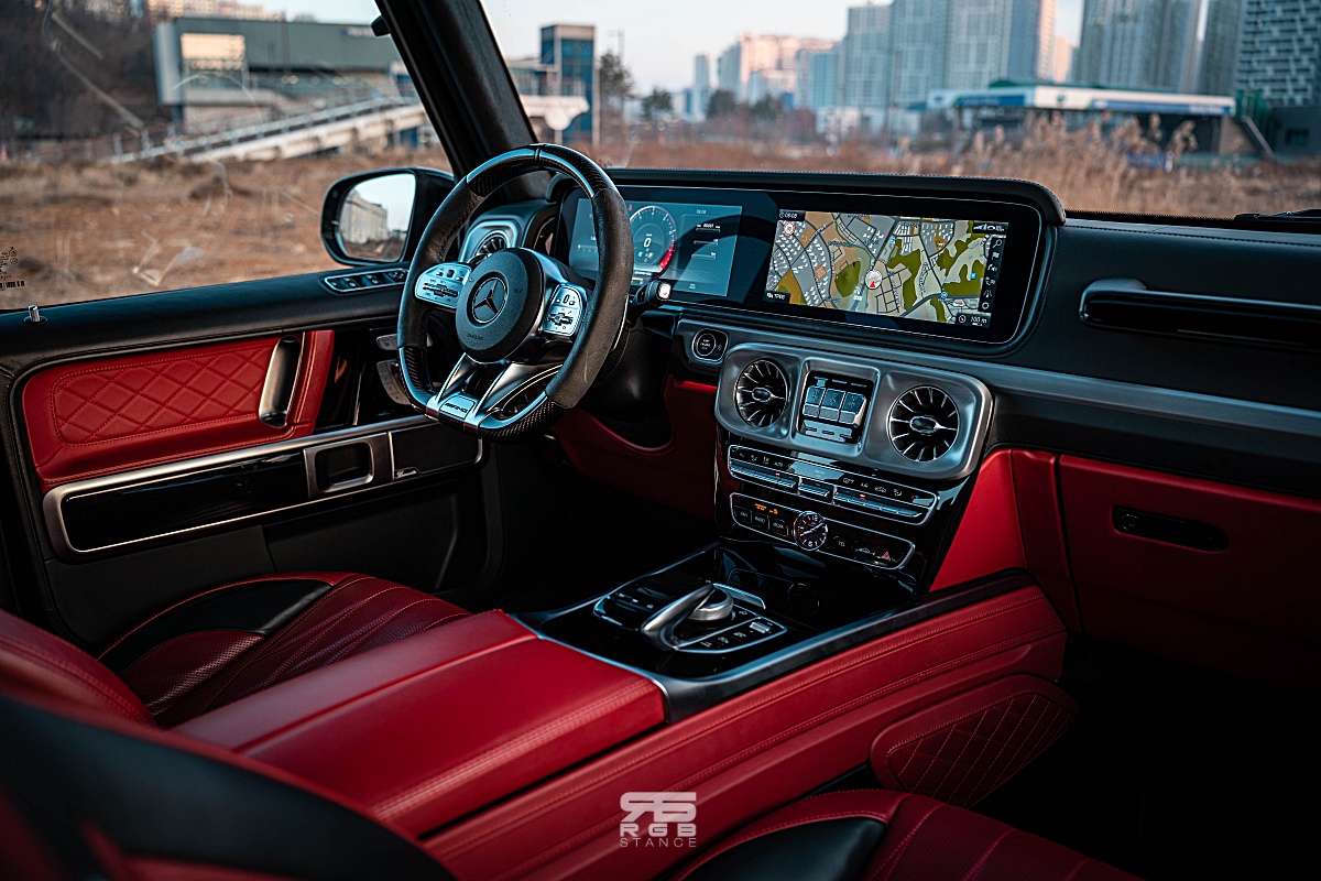 자신감 넘치는 디자인은 실내에서도 이어진다. 내려다보는 높이가 꽤 있는 편인 G63 AMG 의 실내는 AMG 모델답게 카본파이버와 알칸타라로 장식된 휠과 함께 앰비언트 라이트 및 계기판과 인포테인먼트 디스플레이가 하나로 이어진 것처럼 길게 만들어진 와이드 스크린 콕핏이 실내를 더욱 고급스럽게 만들어준다. 여기에 고급스러운 나파가죽은 실내분위기를 한층 돋보이게 만들어주는데, 아쉽게도 디스플레이 터치는 되지 않는다. 그래도 애플 카플레이와 안드로이드 오토가 연결되어 조금 더 편리하게 사용이 가능하다.