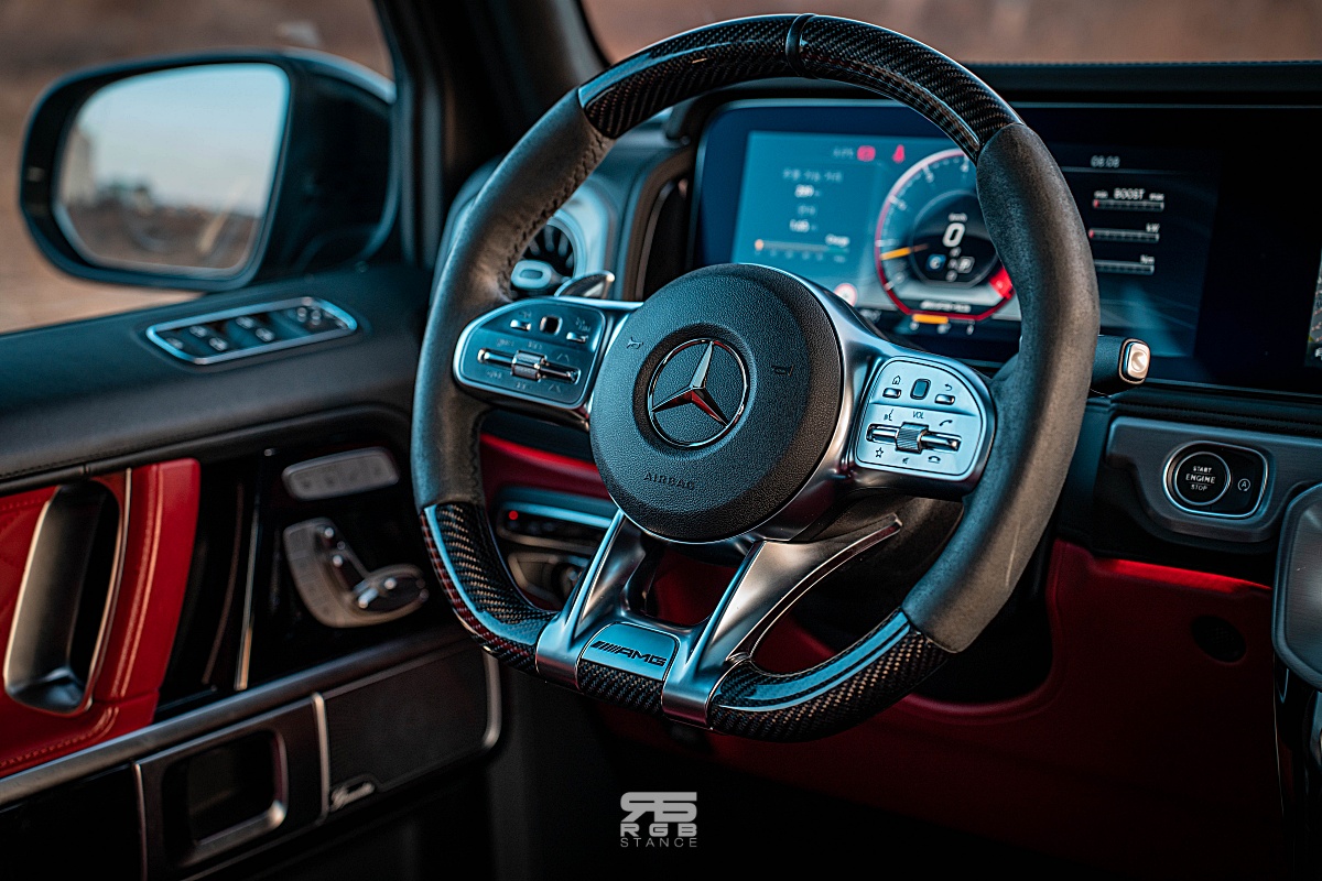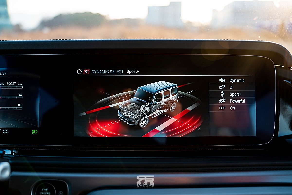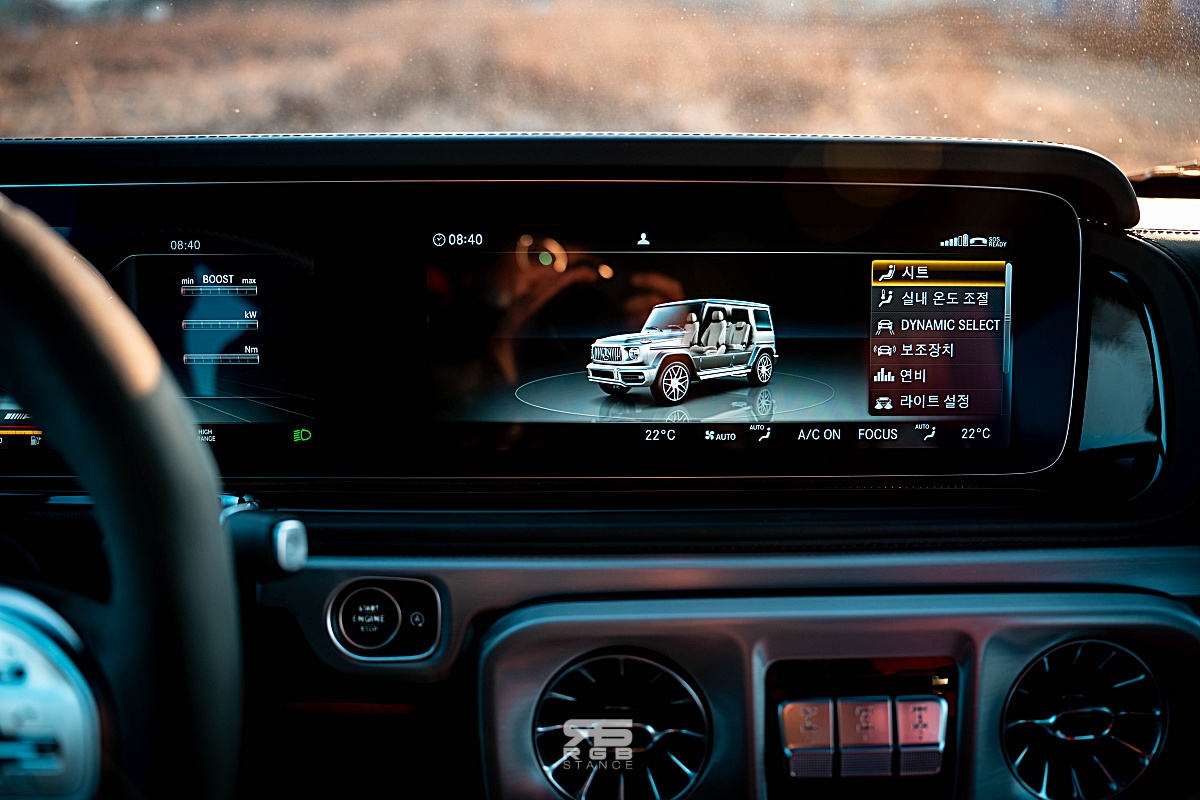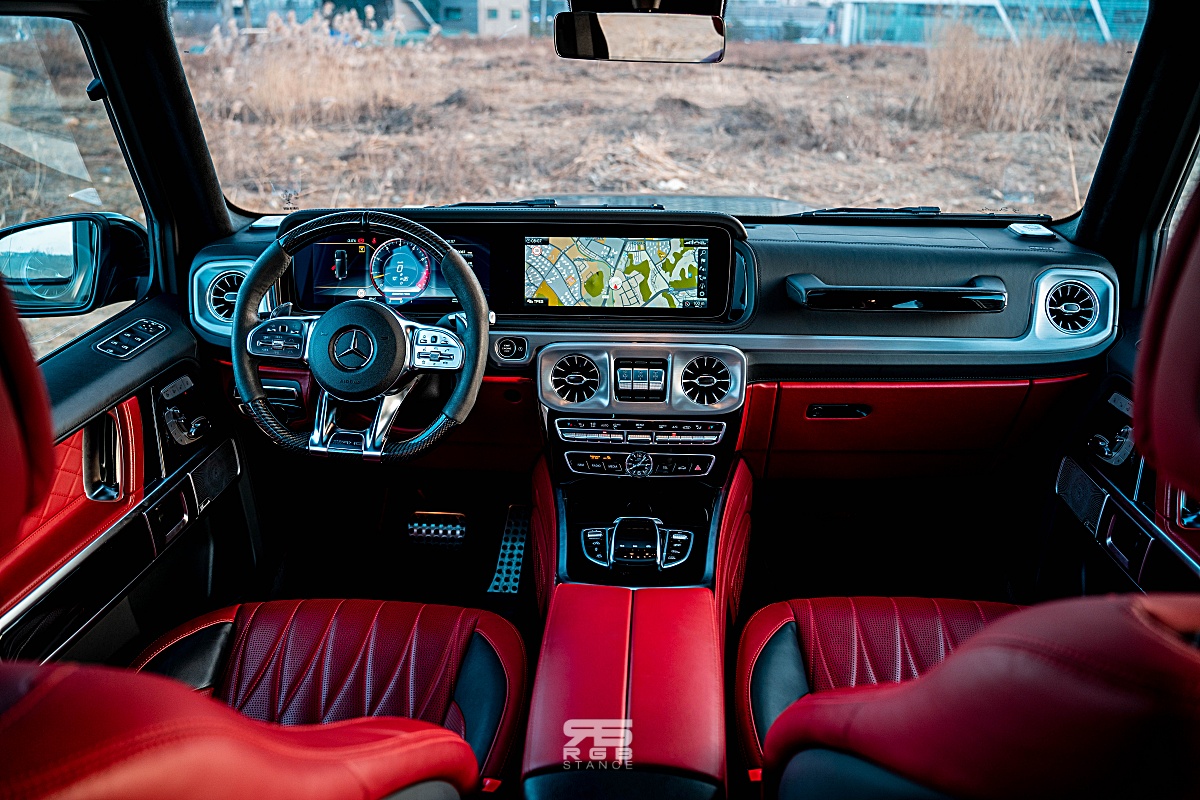 자신감 넘치는 디자인은 실내에서도 이어진다. 내려다보는 높이가 꽤 있는 편인 G63 AMG 의 실내는 AMG 모델답게 카본파이버와 알칸타라로 장식된 휠과 함께 앰비언트 라이트 및 계기판과 인포테인먼트 디스플레이가 하나로 이어진 것처럼 길게 만들어진 와이드 스크린 콕핏이 실내를 더욱 고급스럽게 만들어준다. 여기에 고급스러운 나파가죽은 실내분위기를 한층 돋보이게 만들어주는데, 아쉽게도 디스플레이 터치는 되지 않는다. 그래도 애플 카플레이와 안드로이드 오토가 연결되어 조금 더 편리하게 사용이 가능하다.