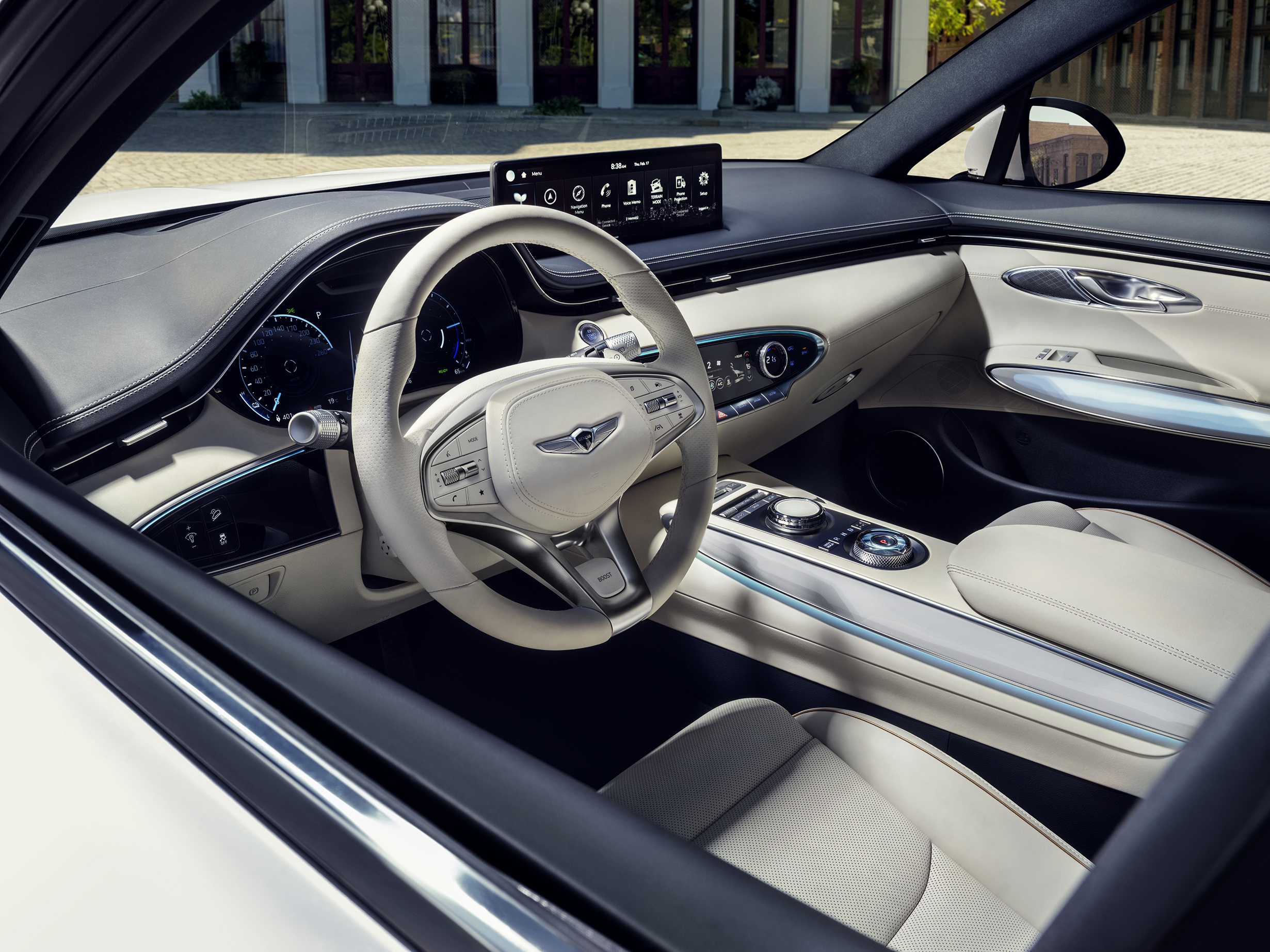 또한 전동화 모델 전용 GUI(Graphical User Interface)를 적용한 12.3인치 클러스터는 하이테크한 분위기를 만들어준다. 제네시스는 GV70 실내에 친환경 소재를 사용함으로써 브랜드가 추구하는 지속가능성을 구현했다. 재활용 페트(PET)를 활용한 원단을 차량 천장(헤드라이닝)에 적용했으며, 울 원단이 함유된 천연가죽 시트를 통해 자연 친화적인 이미지의 고급스러운 실내를 연출했다.