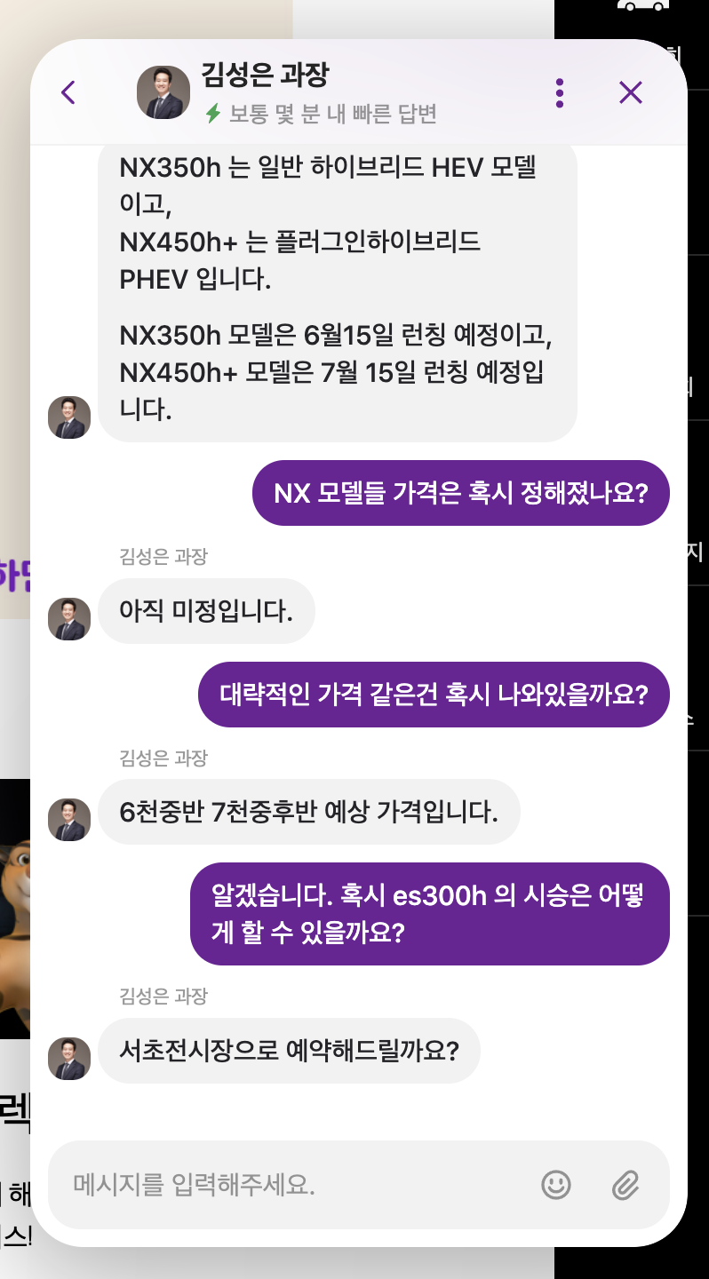 홈페이지 우측 하단에 위치한 ‘신차견적 채팅상담’ 버튼을 클릭하면, 전시장을 선택하고, 관심있는 차량에 대한 문의가 가능하다. 예를 들어 요즘 한창 인기인 렉서스 ES300h 의 프로모션이나 기존 차량에 대한 차별점 및 기타 궁금한 사항들을 알아볼 수 있고, 앞으로 출시 예정인 신형 렉서스 NX 모델에 대한 예상 가격이나 런칭 예정일까지 안내를 받아볼 수 있었다.