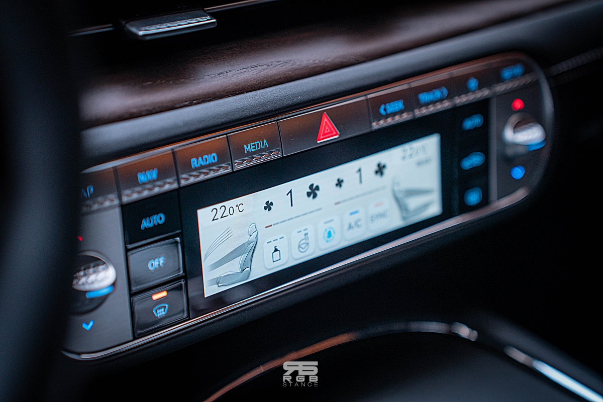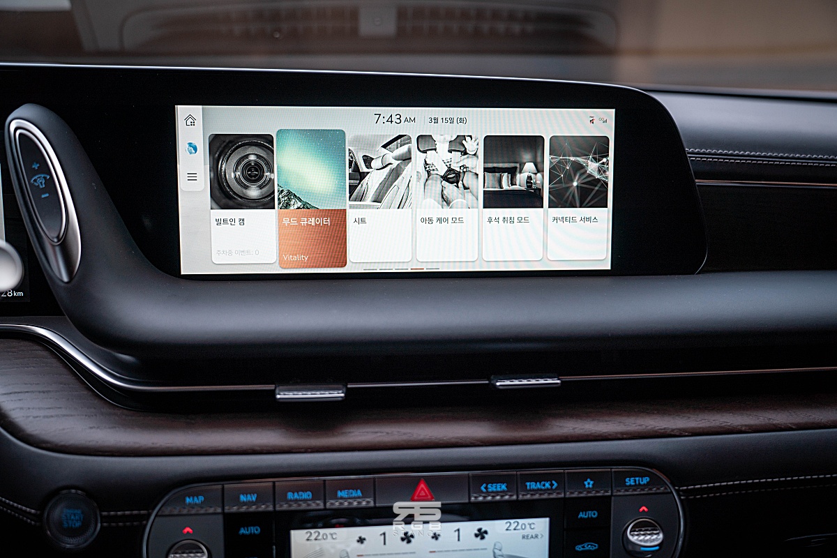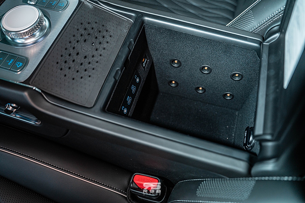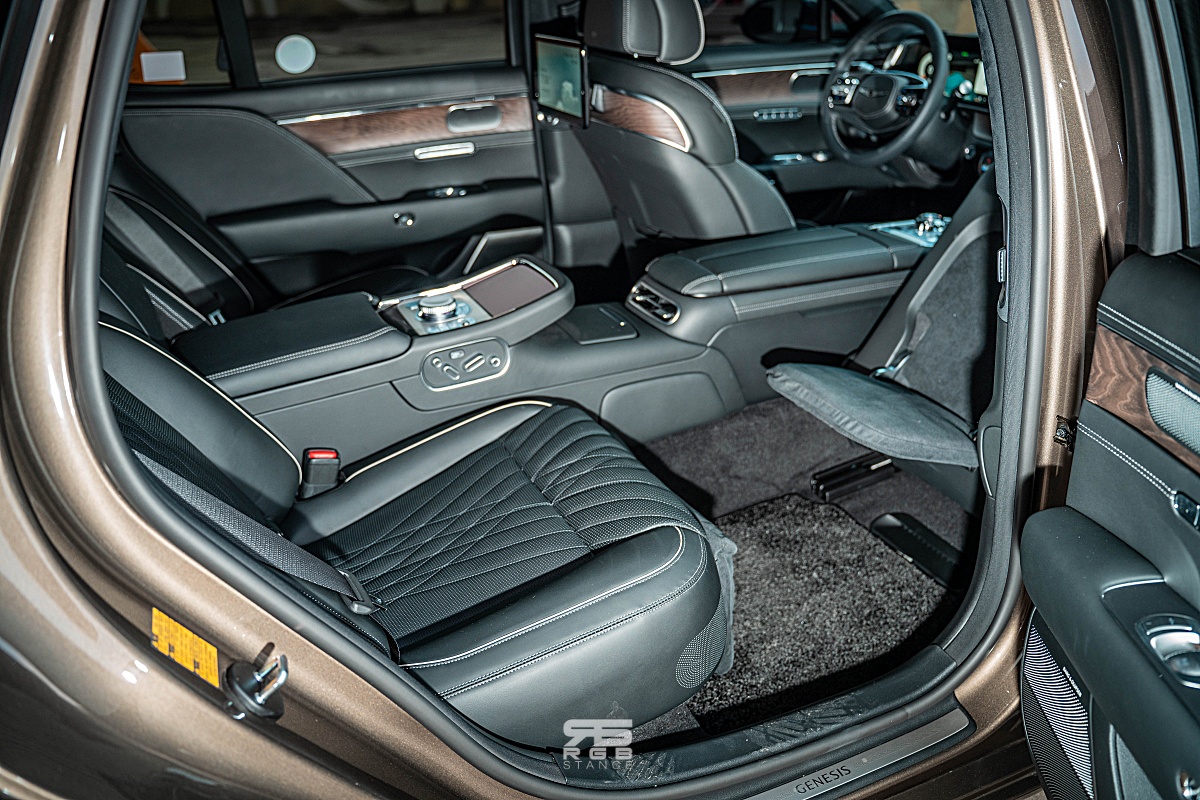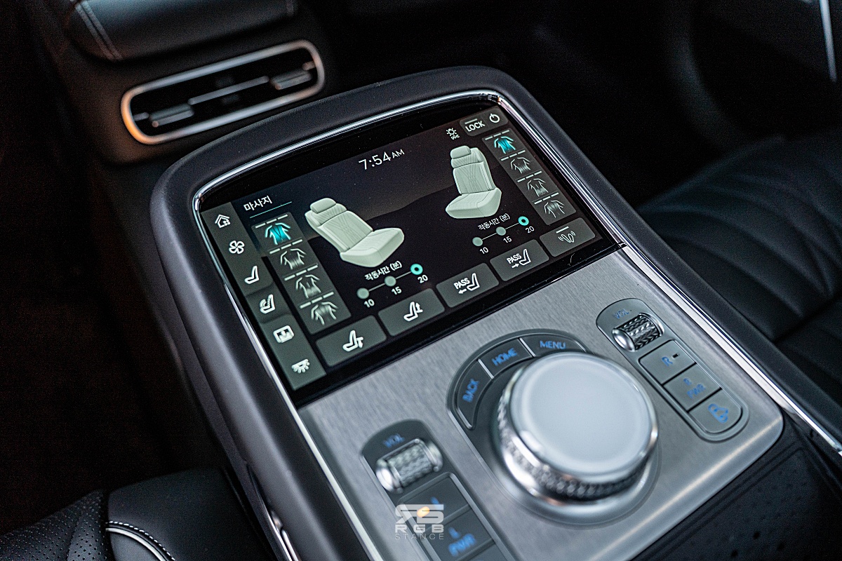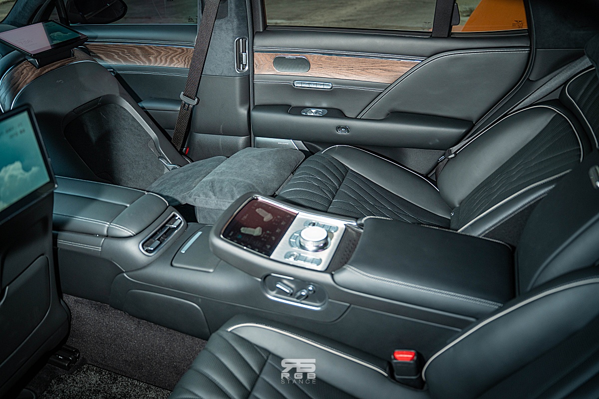 이 외에도 2열에는 마사지 기능이 들어간 전동시트는 조수석을 접어 레그레스트 & 풋레스트 기능으로 더욱 넓고 편안한 공간으로 변신이 가능하며, 리어센터콘솔에 UV-C 살균장치가 있어서 소지품들의 살균이 가능하다. 또한, 무드 큐레이터로 차 안의 향기와 음악, 조명과 커튼 및 마사기 기능이 연동되어 공간을 더욱 감성적으로 만들어준다. 이렇게 G90 의 2열은 여유로운 휴식이 가능한 쇼퍼드리븐의 영역을 충분히 수행하고 있다.