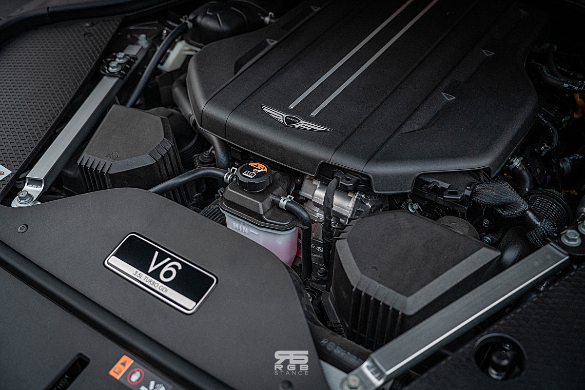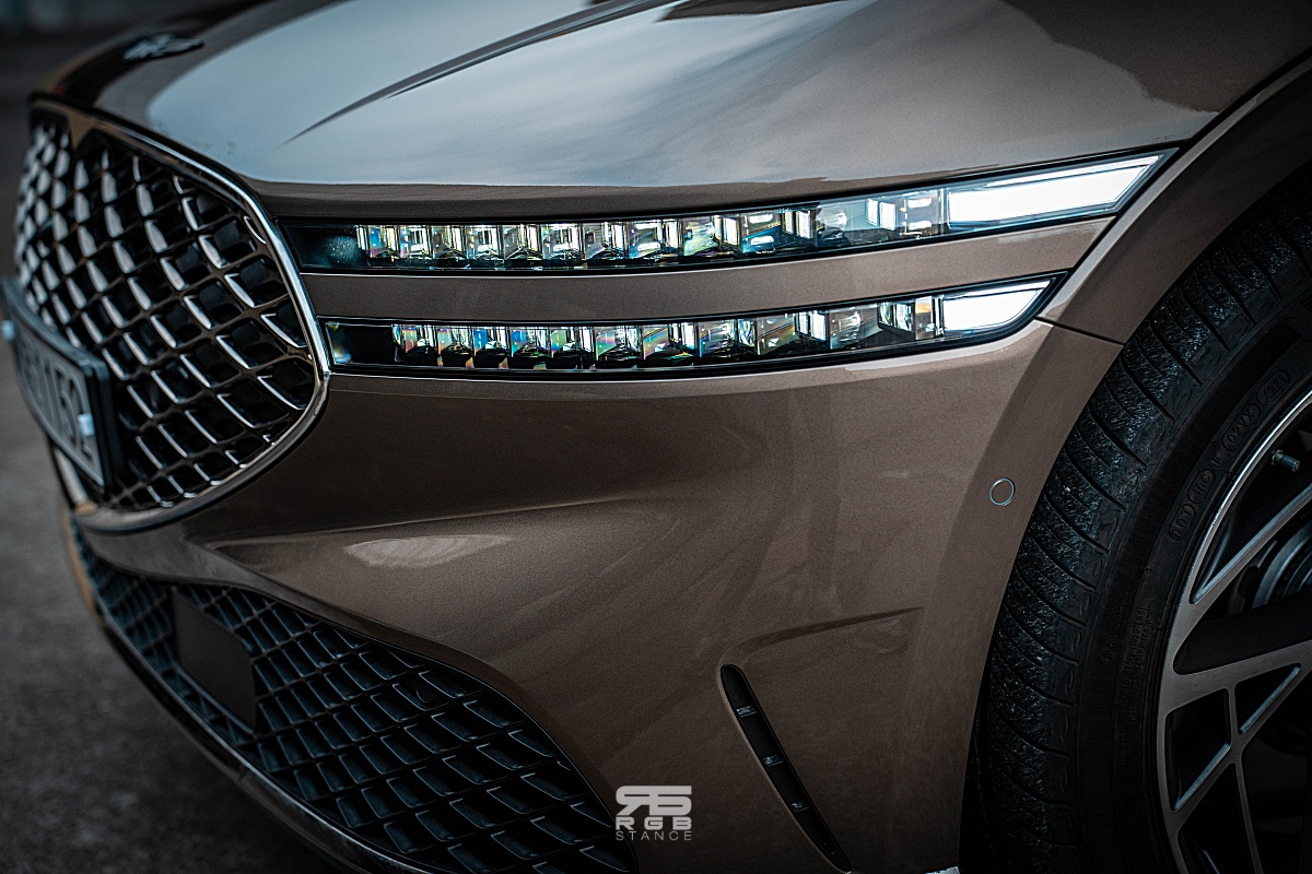 제네시스의 상징인 ‘두 줄’ 부터 눈에 잘 띈다. 제네시스의 로고를 형상화한 커다란 크레스트 그릴과 그 옆의 두 줄 헤드램프를 시작해 커다란 클램쉘(Clamshell) 디자인의 본넷은 시각적으로 간결하면서도 볼륨감 있는 모습을 보여준다.