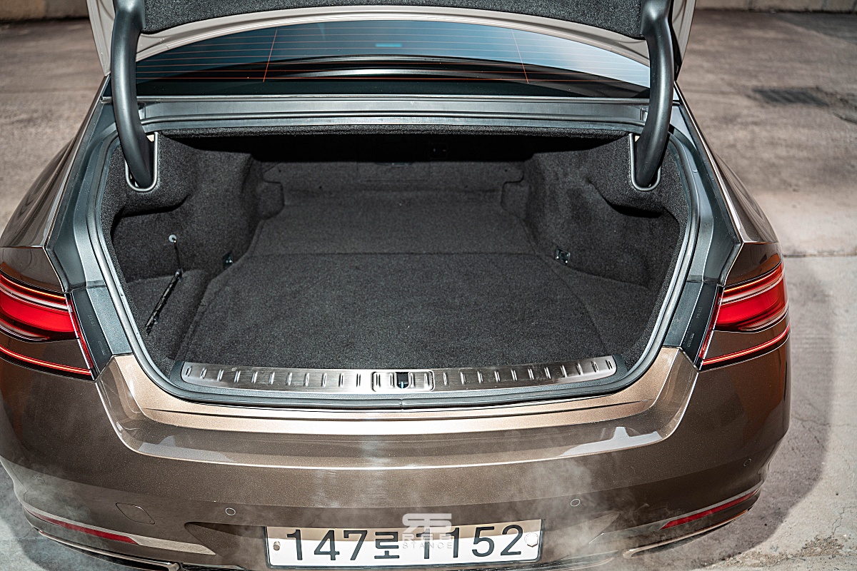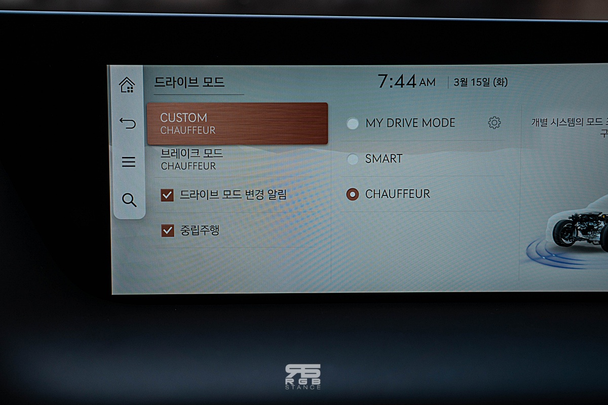 럭셔리 세단답게 주행감각은 상당히 부드럽다. 너무나도 당연한 말이지만, 스포츠 세단이 아니기에 부드러우면서도 묵직한 가속감을 보여주며, RWS(Rear Wheel Steering) 시스템으로 저속 역상(전륜과 반대 반향)에서는 최대 4도, 고속동상(전륜과 같은 방향)에서는 최대 2도 범위 내에서 뒷바퀴를 조향해주는데 회전반경을 줄여줄 뿐 아니라, 중고속 주행시 민첩한 차체 기동을 보여주는 것과 함께 코너에서도 큰 차체를 부드럽고 편하게 돌아나갈 수 있게 해준다. 오너드리븐으로도 충분히 드라이빙의 즐거움을 느낄 수 있는데, 드라이브 모드를 3초 정도 길게 눌러 ‘쇼퍼드리븐 모드’ 로 변경하고 브레이크 세팅값 변경 등을 설정하고 주행을 해보면, 강한 브레이킹시에도 조금 더 여유롭게 브레이킹이 잡혀 2열에서도 편안한 승차감을 즐길 수 있도록 배려해 놓았다. 참고로 드라이브 모드를 ‘스포츠’ 로 놓으면, 에르고시트가 옆구리를 잡아주어 드라이빙을 즐길 수 있게 해주며, 편안한 승차감을 보여주는데, 여기에는 멀티 챔버 에어 서스펜션도 큰 몫을 해주고 있다.