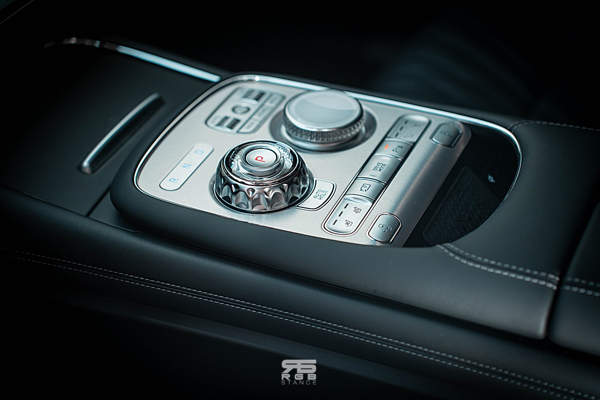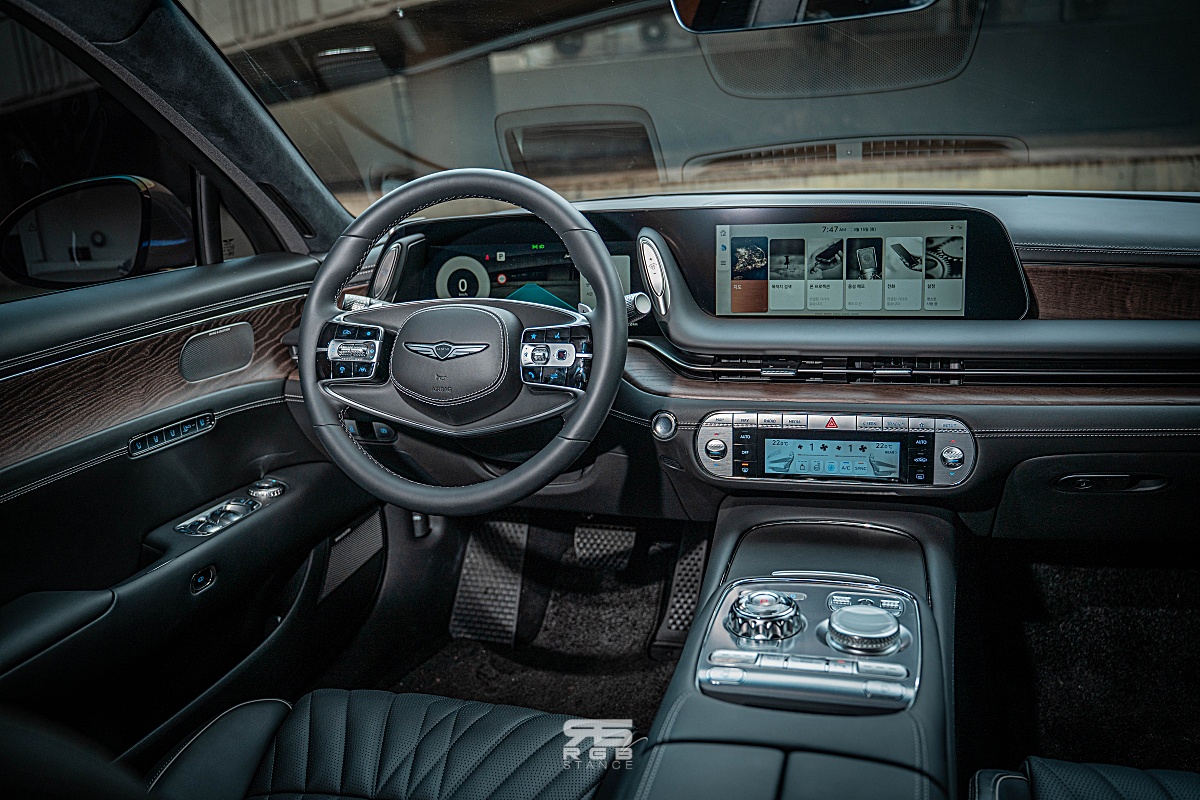 1열에서는 오너드리븐을 만족시키기 충분한 슬림한 송풍구 및 파노라믹 디스플레이가 하이테크한 이미지를 강조해주고 있으며, 전자식 변속 다이얼은 G-Matrix 패턴을 적용해 보석같은 고급스러운. 감성을 보여준다. 이 외에도 아날로그적 감성과 하이테크 감성이 조화로워 새로운 럭셔리 감성을 보여주고 있다. 그리고, 본격적으로 주행을 해보면 G90 의 여유로운 주행질감을 느낄 수 있다.